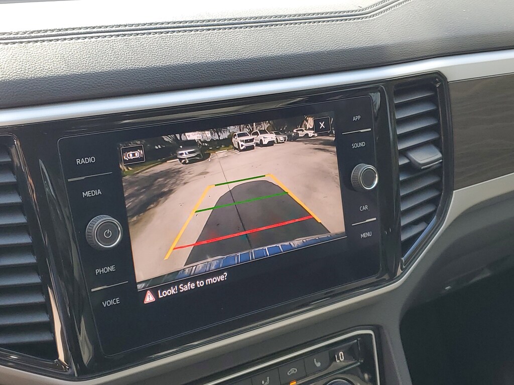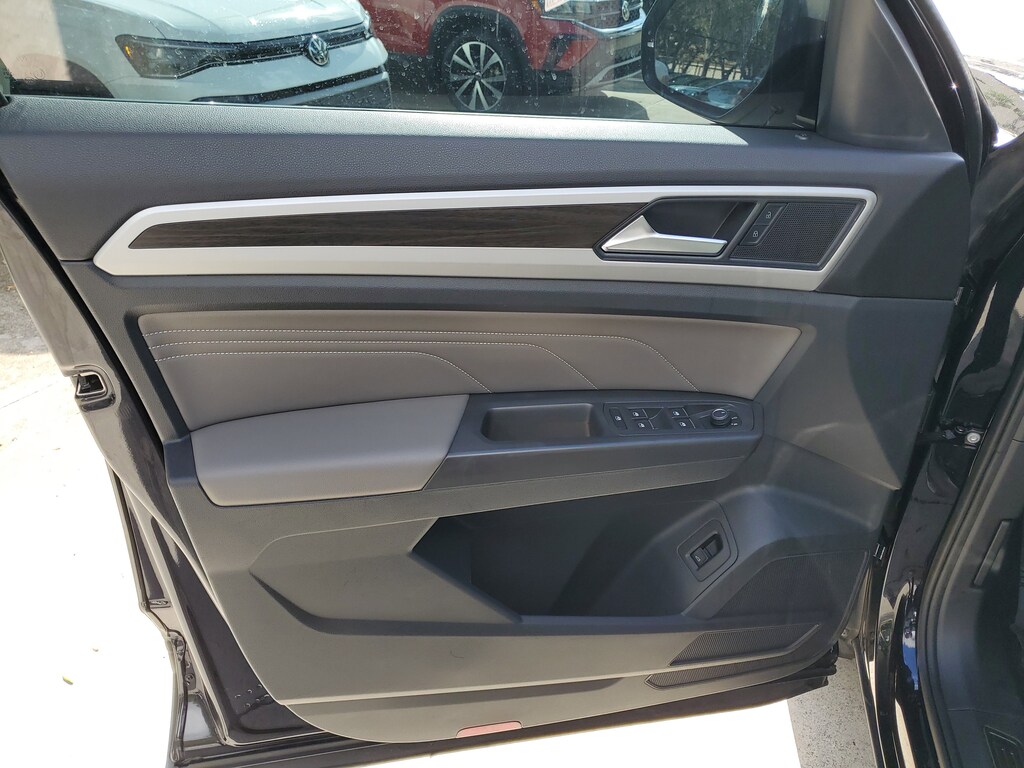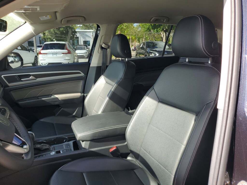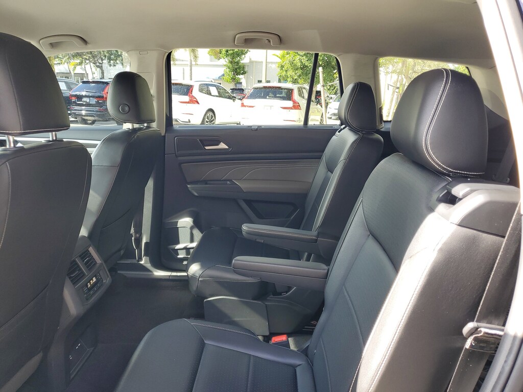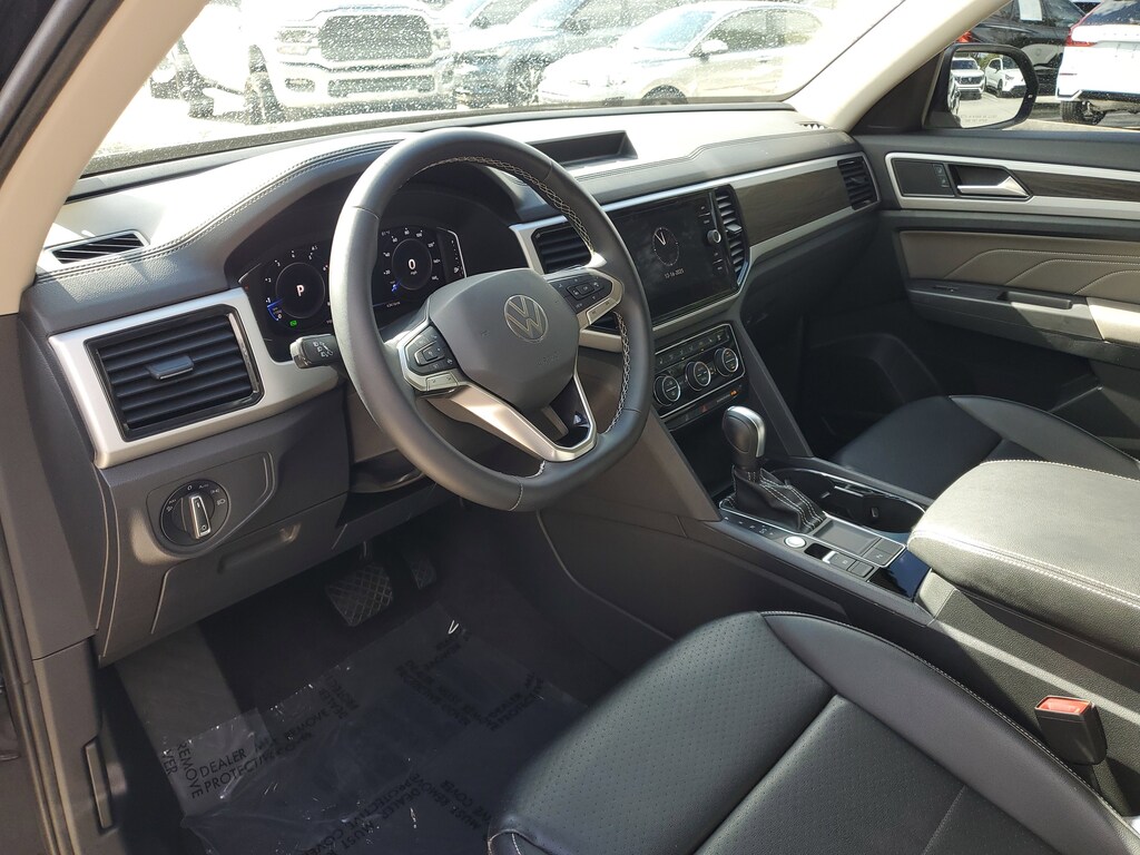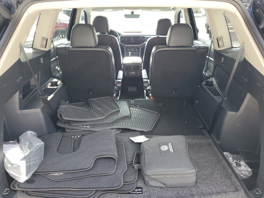 CARFAX One-Owner. Deep Black 2022 Volkswagen Atlas 2.0T SE w/Technology 2.0L TSI 8-Speed Automatic with Tiptronic FWD 2nd-Row Dual Captain's Chairs, 3.60 Axle Ratio, 3rd row seats: split-bench, 4-Wheel Disc Brakes, 6 Speakers, ABS brakes, Air Conditioning, Alloy wheels, AM/FM radio: SiriusXM with 360L, Auto-Dimming Rear-View Mirror, Auto-dimming Rear-View mirror, Automatic temperature control, Brake assist, Bumpers: body-color, Carpeted Mats Kit - Captain's Chairs, Compass, Delay-off headlights, Driver door bin, Driver vanity mirror, Dual front impact airbags, Dual front side impact airbags, Electronic Stability Control, Emergency communication system, Exterior Parking Camera Rear, First Aid Kit, Four wheel independent suspension, Front anti-roll bar, Front Bucket Seats, Front Center Armrest, Front dual zone A/C, Front fog lights, Front reading lights, Fully automatic headlights, Heated Comfort Front Bucket Seats, Heated door mirrors, Heated front seats, Illuminated entry, Leather Shift Knob, Low tire pressure warning, Occupant sensing airbag, Outside temperature display, Overhead airbag, Overhead console, Panic alarm, Passenger door bin, Passenger vanity mirror, Perforated V-Tex Leatherette Seating Surfaces, Power door mirrors, Power driver seat, Power Liftgate, Power steering, Power windows, Privacy Cover (DISC), Radio data system, Radio: MIB3 Composition Media w/8" Touchscreen, Rain sensing wipers, Rear air conditioning, Rear anti-roll bar, Rear reading lights, Rear seat center armrest, Rear window defroster, Rear window wiper, Remote keyless entry, Roadside Assistance Kit (DISC), Roof rack: rails only, Security system, Speed control, Speed-sensing steering, Split folding rear seat, Spoiler, Standard Suspension, Steering wheel mounted audio controls, Tachometer, Telescoping steering wheel, Tilt steering wheel, Traction control, Trip computer, Trunk Liner w/VW CarGo Blocks, Turn signal indicator mirrors, Variably intermittent wipers, and Wheels: 20" x 8J 5-Spoke Silver Painted Alloy.