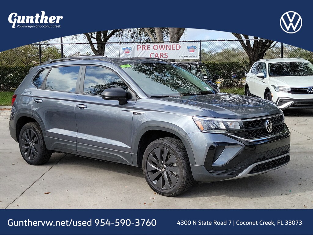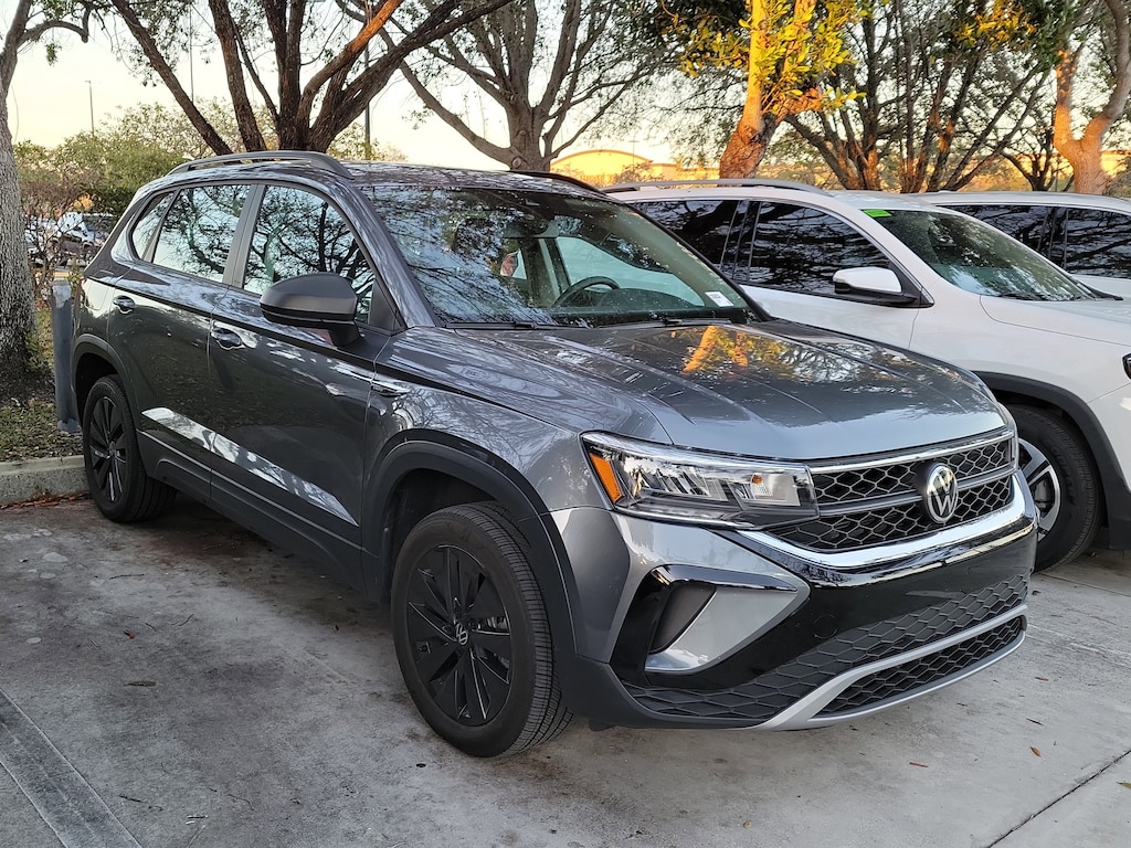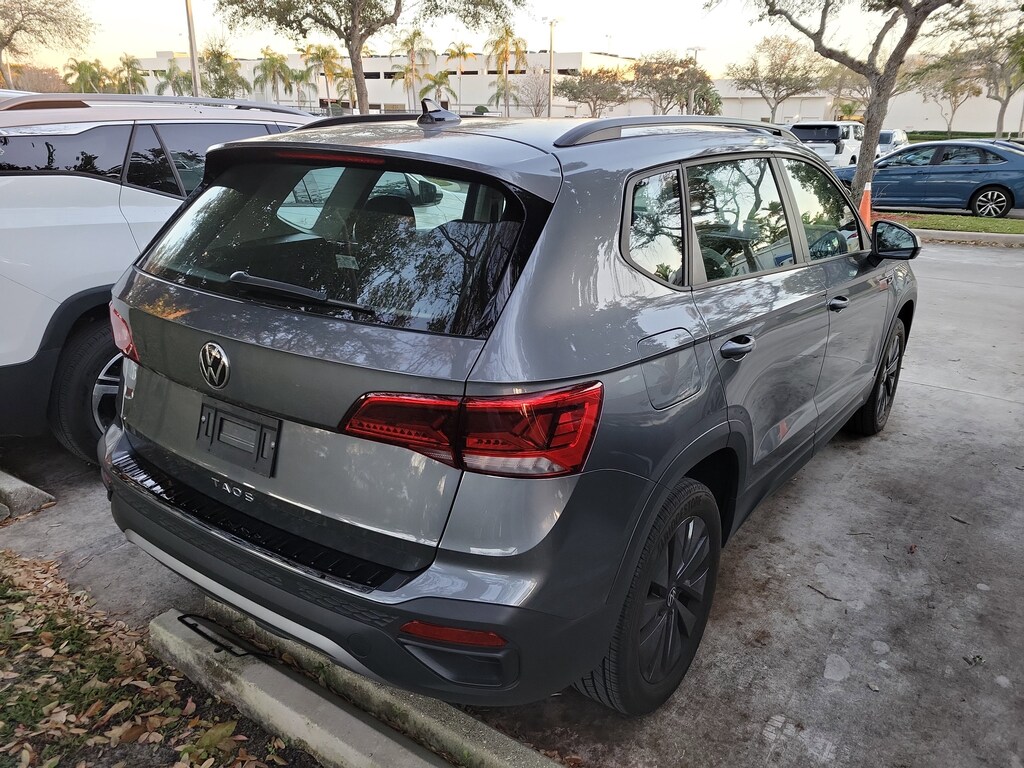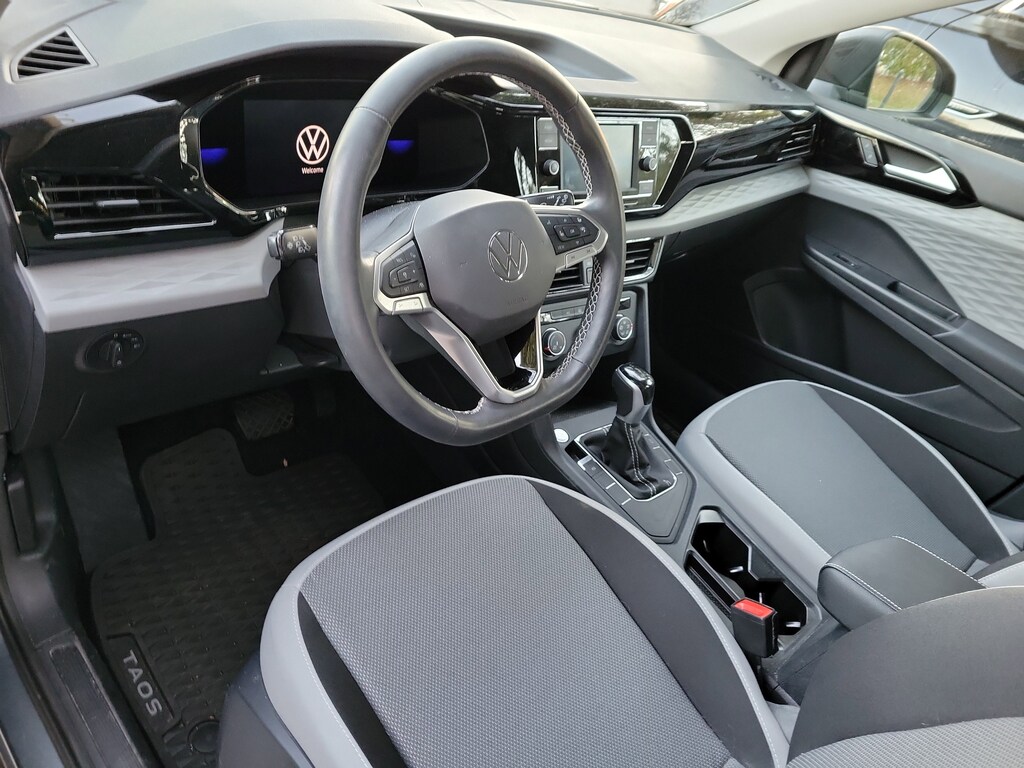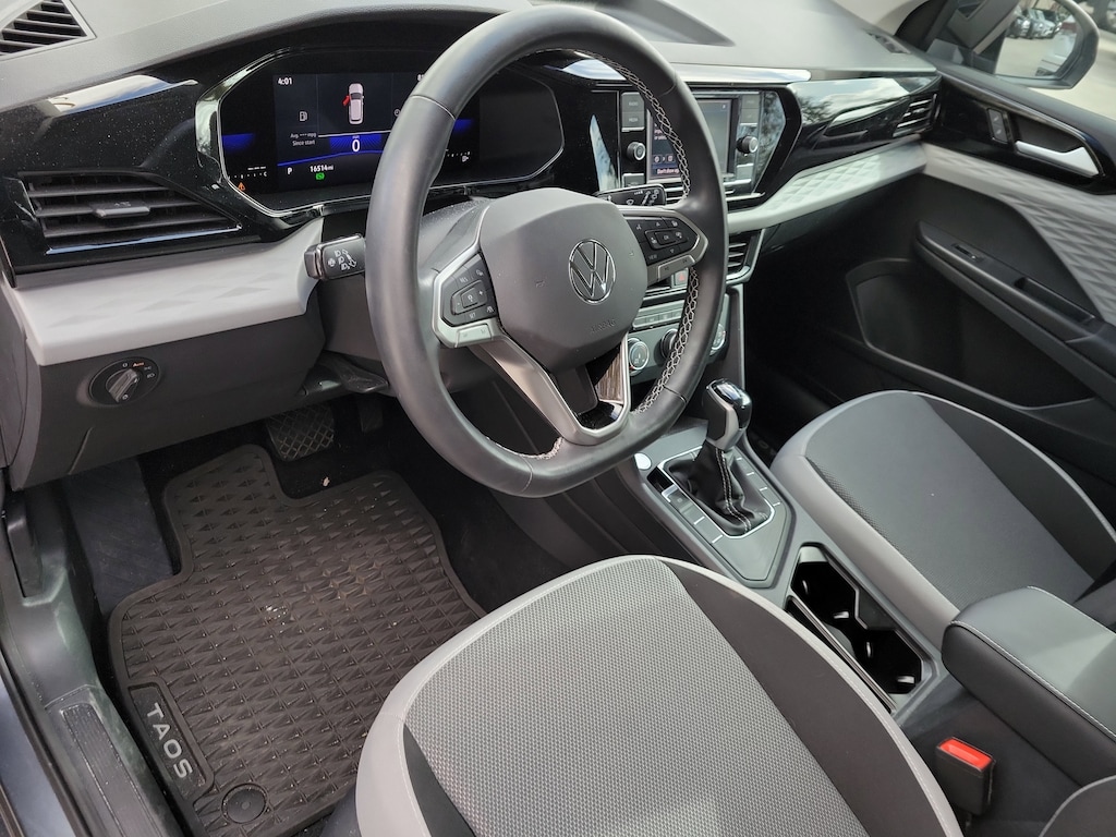 CARFAX One-Owner. Platinum Gray Metallic 2022 Volkswagen Taos 1.5T S 1.5L I4 Turbocharged DOHC 16V LEV3-SULEV30 158hp 8-Speed Automatic with Tiptronic FWD IQ.DRIVE S Package (Active Blind Spot Monitor, Adaptive Cruise Control (ACC) w/Stop & Go, Emergency Assist, Front Assist, Hands-On Detection Sensor Steering Wheel, Lane Assist (Lane Keeping System), Rear Traffic Alert, and Travel Assist (Semi-Automated Driving Assistance)), S Convenience Package (Automatic Rain-Sensing Front Wipers, Heated Leatherette-Wrapped Steering Wheel, Leather-Trimmed Shifter, and Light Assist (High Beam Control)), 17" Silver Alloy Wheels, 3.23 Axle Ratio, 4-Wheel Disc Brakes, 6 Speakers, ABS brakes, Air Conditioning, Alloy wheels, AM/FM radio, Brake assist, Bumpers: body-color, Cloth Seating Surfaces, Compass, Delay-off headlights, Driver door bin, Driver vanity mirror, Dual front impact airbags, Dual front side impact airbags, Electronic Stability Control, Emergency communication system: Car-Net, Exterior Parking Camera Rear, First Aid Kit, Front anti-roll bar, Front Bucket Seats, Front Center Armrest, Front reading lights, Front Strut Rear Torsion Beam Suspension, Front wheel independent suspension, Fully automatic headlights, Illuminated entry, Low tire pressure warning, Occupant sensing airbag, Outside temperature display, Overhead airbag, Overhead console, Panic alarm, Passenger door bin, Passenger vanity mirror, Power door mirrors, Power steering, Power windows, Radio data system, Radio: Composition Color AM/FM, Rear anti-roll bar, Rear seat center armrest, Rear window defroster, Rear window wiper, Remote keyless entry, Roadside Assistance Kit, Roof rack: rails only, Rubber Mats Kit (SNM), Speed control, Speed-sensing steering, Split folding rear seat, Spoiler, Steering wheel mounted audio controls, Tachometer, Telescoping steering wheel, Tilt steering wheel, Traction control, Trip computer, and Variably intermittent wipers.