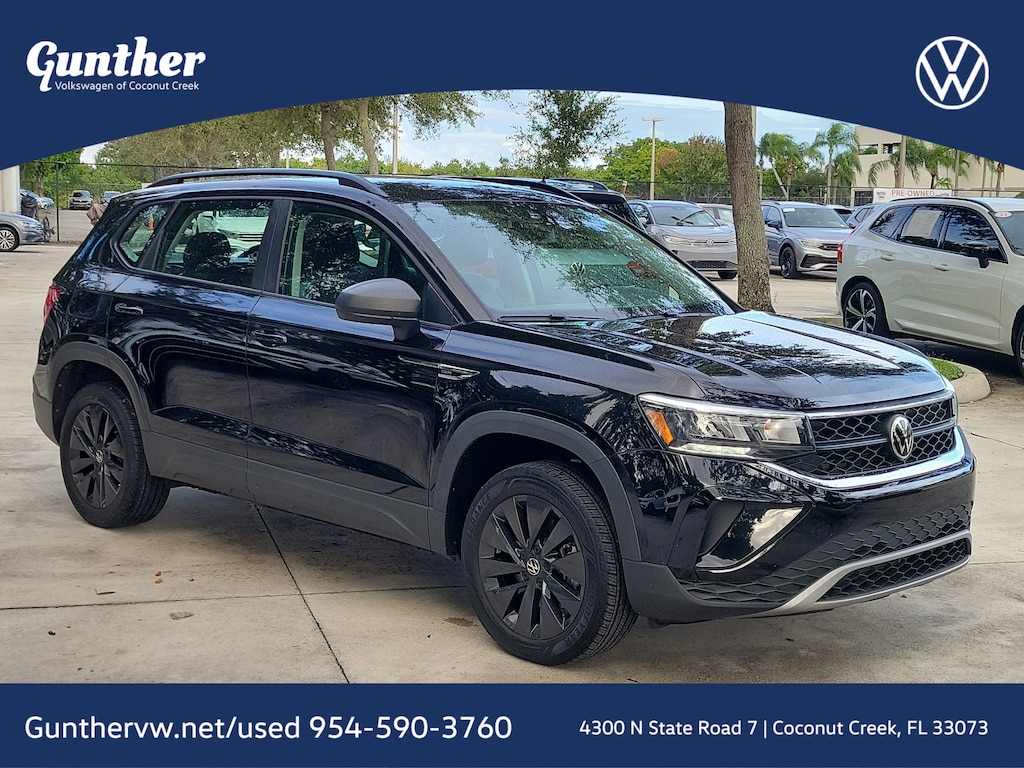 CARFAX One-Owner. Certified. Deep Black 2022 Volkswagen Taos 1.5T S 1.5L I4 Turbocharged DOHC 16V LEV3-SULEV30 158hp 8-Speed Automatic with Tiptronic FWD 17" Silver Alloy Wheels, 3.23 Axle Ratio, 4-Wheel Disc Brakes, 6 Speakers, ABS brakes, Air Conditioning, Alloy wheels, AM/FM radio, Brake assist, Bumpers: body-color, Cloth Seating Surfaces, Compass, Delay-off headlights, Driver door bin, Driver vanity mirror, Dual front impact airbags, Dual front side impact airbags, Electronic Stability Control, Emergency communication system: Car-Net, Exterior Parking Camera Rear, Front anti-roll bar, Front Bucket Seats, Front Center Armrest, Front reading lights, Front Strut Rear Torsion Beam Suspension, Front wheel independent suspension, Fully automatic headlights, Illuminated entry, Low tire pressure warning, Occupant sensing airbag, Outside temperature display, Overhead airbag, Overhead console, Panic alarm, Passenger door bin, Passenger vanity mirror, Power door mirrors, Power steering, Power windows, Radio data system, Radio: Composition Color AM/FM, Rear anti-roll bar, Rear seat center armrest, Rear window defroster, Rear window wiper, Remote keyless entry, Roof rack: rails only, Speed control, Speed-sensing steering, Split folding rear seat, Spoiler, Steering wheel mounted audio controls, Tachometer, Telescoping steering wheel, Tilt steering wheel, Traction control, Trip computer, and Variably intermittent wipers.