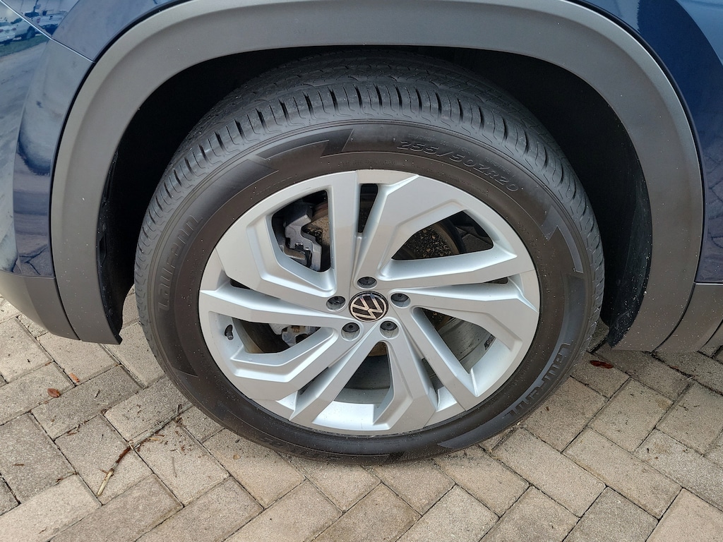 CARFAX One-Owner. Certified. Blue Metallic 2023 Volkswagen Atlas Cross Sport 3.6L V6 SE w/Technology 3.6L VR6 8-Speed Automatic with Tiptronic FWD Black Wheel Package (Wheels: 20" x 8J 5-Spoke Black Painted Alloy), Panoramic Sunroof Package (Power Tilting & Sliding Panoramic Sunroof), 3.60 Axle Ratio, 4-Wheel Disc Brakes, 6 Speakers, ABS brakes, Air Conditioning, Alloy wheels, AM/FM radio: SiriusXM with 360L, Auto-dimming Rear-View mirror, Automatic temperature control, Brake assist, Bumpers: body-color, Compass, Delay-off headlights, Driver door bin, Driver vanity mirror, Dual front impact airbags, Dual front side impact airbags, Electronic Stability Control, Emergency communication system: VW Car-Net Safe & Secure 5-year, Exterior Parking Camera Rear, First Aid Kit, Four wheel independent suspension, Frameless Auto-Dimming Rearview Mirror, Front anti-roll bar, Front Bucket Seats, Front Center Armrest, Front dual zone A/C, Front fog lights, Front reading lights, Fully automatic headlights, Heated Comfort Front Bucket Seats, Heated door mirrors, Heated front seats, Heavy Duty Trunk Liner w/VW CarGo Blocks, Illuminated entry, Leather Shift Knob, Low tire pressure warning, Occupant sensing airbag, Outside temperature display, Overhead airbag, Overhead console, Panic alarm, Passenger door bin, Passenger vanity mirror, Perforated V-Tex Leatherette Seating Surfaces, Power door mirrors, Power driver seat, Power Liftgate, Power steering, Power windows, Privacy Cover, Radio data system, Radio: MIB3 Composition Media w/8" Touchscreen, Rain sensing wipers, Rear anti-roll bar, Rear reading lights, Rear seat center armrest, Rear window defroster, Rear window wiper, Remote keyless entry, Roadside Assistance Kit, Roof Rack Base Carrier Bars (Set of 2), Rubber Mats Kit, Security system, Speed control, Speed-sensing steering, Split folding rear seat, Spoiler, Standard Suspension, Steering wheel mounted audio controls, Tachometer, Telescoping steering wheel, Tilt steering wheel, Traction control, Trip computer, Turn signal indicator mirrors, Variably intermittent wipers, Volkswagen Logo Puddle Lights, and Wheels: 20" x 8J 5-Spoke Silver Painted Alloy.
