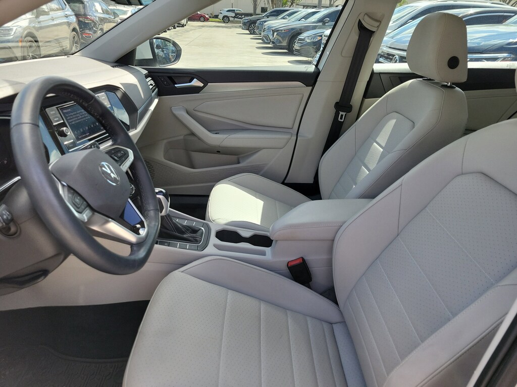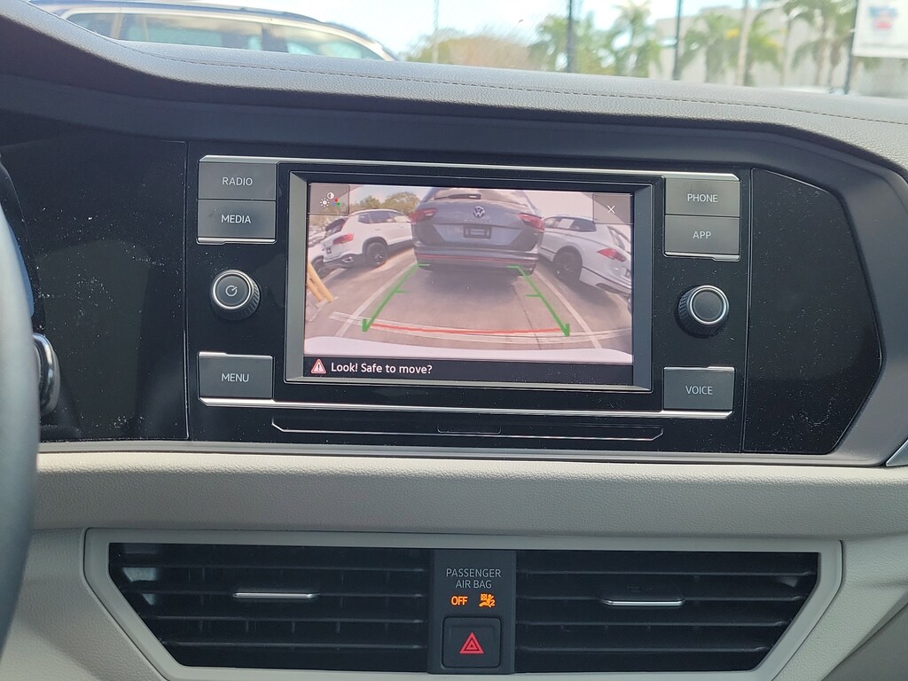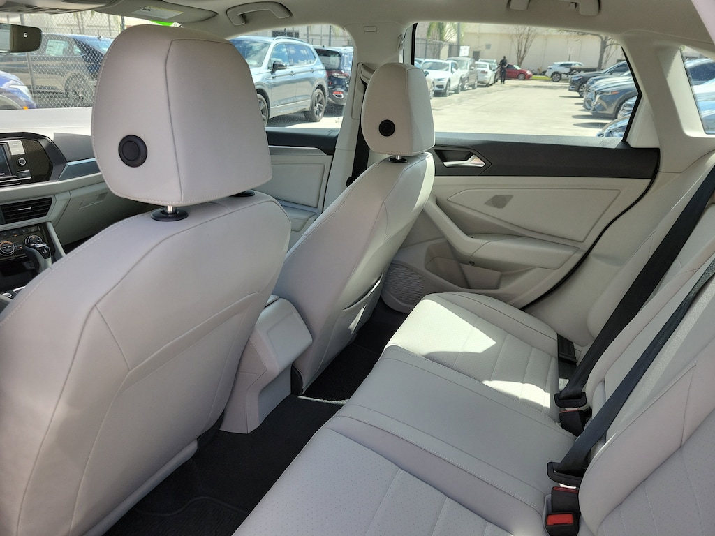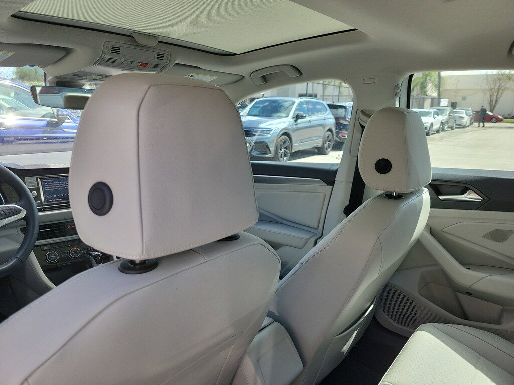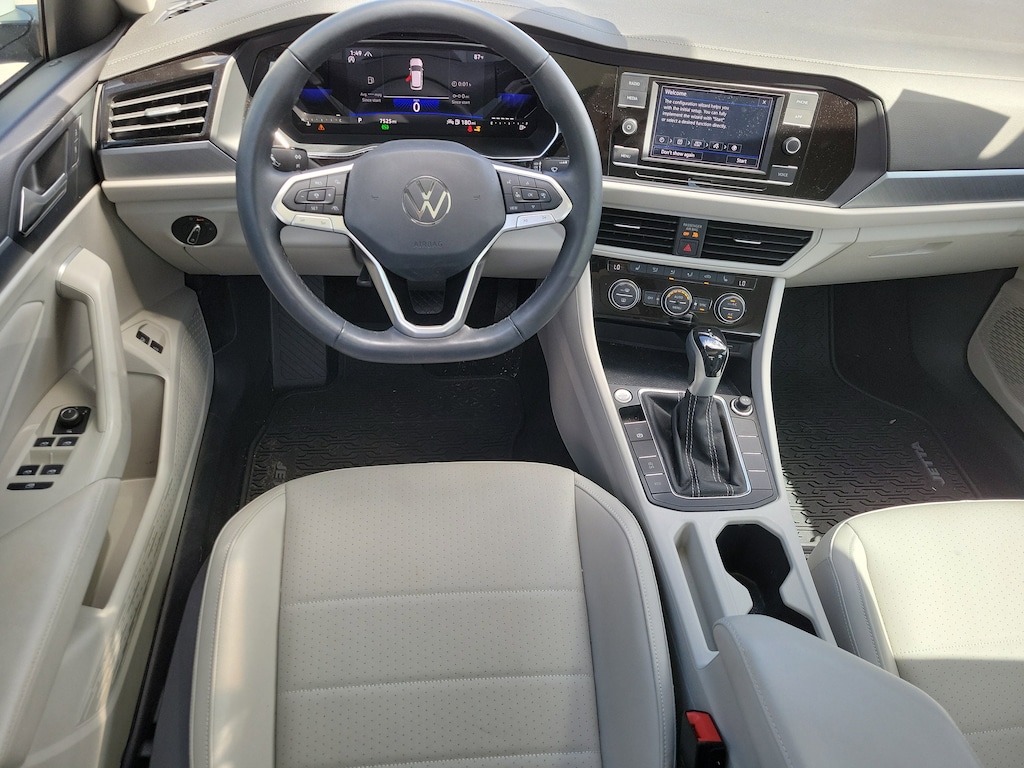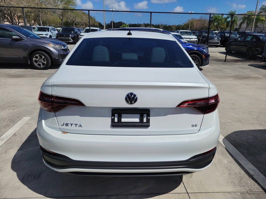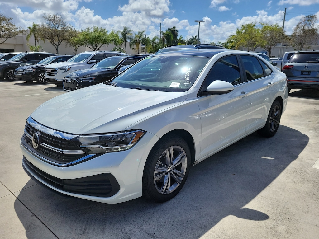 CARFAX One-Owner. Opal White 2023 Volkswagen Jetta 1.5T SE 1.5L I-4 DI DOHC Turbocharged 8-Speed Automatic with Tiptronic FWD Panoramic Sunroof Package (Dual Front Reading Lights, Illuminated Vanity Mirrors, Overhead Storage Compartment, and Power Tilting & Sliding Panoramic Sunroof), 4 Speakers, 4-Wheel Disc Brakes, ABS brakes, Active Blind Spot Monitor, Air Conditioning, Alloy wheels, AM/FM radio, Auto-dimming Rear-View mirror, Auto-Dimming Rearview Mirror w/Electronic Compass, Automatic temperature control, Brake assist, Bumpers: body-color, Credit - Rear Sensors Removed, Delay-off headlights, Driver door bin, Driver vanity mirror, Dual front impact airbags, Dual front side impact airbags, Electronic Stability Control, Emergency communication system: VW Car-Net Safe & Secure 5-year, Exterior Parking Camera Rear, First Aid Kit, Front anti-roll bar, Front Bucket Seats, Front Center Armrest, Front dual zone A/C, Front wheel independent suspension, Fully automatic headlights, Heated door mirrors, Heated Front Comfort Sport Seats, Heated front seats, Heavy Duty Trunk Liner w/VW CarGo Blocks, Illuminated entry, Leather Shift Knob, Low tire pressure warning, Occupant sensing airbag, Outside temperature display, Overhead airbag, Overhead console, Panic alarm, Passenger door bin, Passenger vanity mirror, Power door mirrors, Power driver seat, Power steering, Power windows, Radio data system, Radio: MIB3 Composition Color w/6.5" Touchscreen, Rain sensing wipers, Rear anti-roll bar, Rear reading lights, Rear seat center armrest, Rear window defroster, Remote keyless entry, Roadside Assistance Kit, Rubber Monster Mats Kit (Set of 4), Speed control, Speed-sensing steering, Split folding rear seat, Steering wheel mounted audio controls, Tachometer, Telescoping steering wheel, Tilt steering wheel, Traction control, Trip computer, V-Tex Leatherette Seat Trim, Variably intermittent wipers, and Wheels: 17" Twin 5-Spoke Silver Painted Alloy.