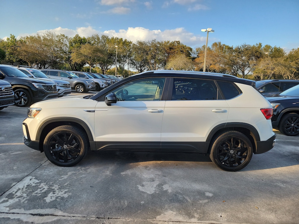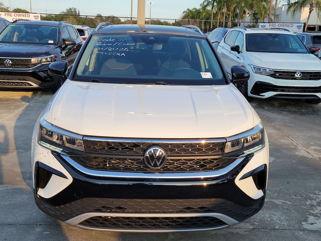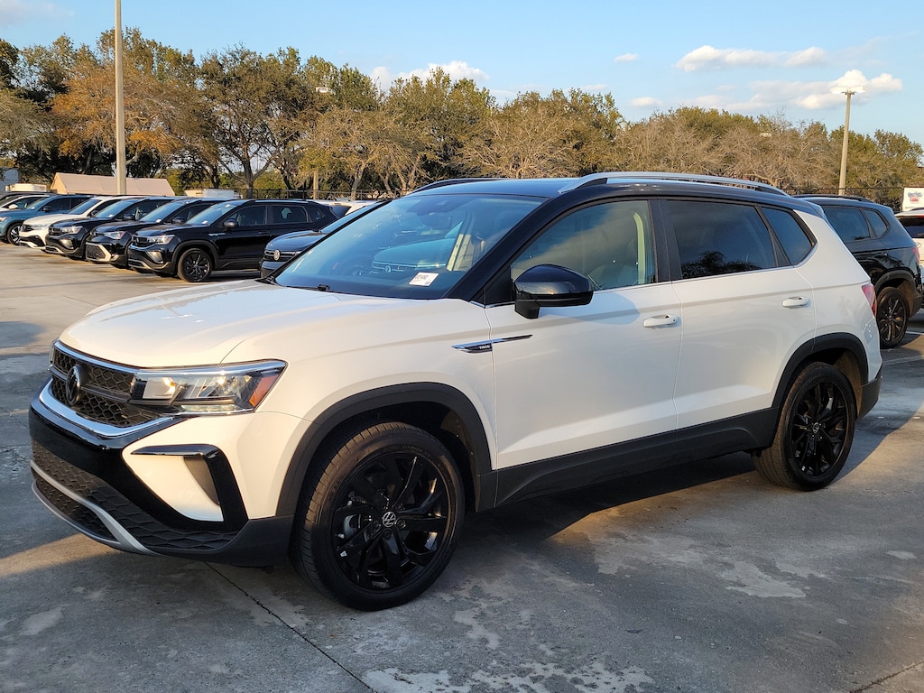 CARFAX One-Owner. Pure White 2023 Volkswagen Taos 1.5T SE 1.5L I4 Turbocharged DOHC 16V LEV3-SULEV30 158hp 8-Speed Automatic with Tiptronic FWD Black Wheel Package (Wheels: 18" Black Painted Alloy), Panoramic Sunroof Package, 3.23 Axle Ratio, 4-Wheel Disc Brakes, 6 Speakers, ABS brakes, Active Blind Spot Monitor, Air Conditioning, Alloy wheels, AM/FM radio: SiriusXM with 360L, Auto High-beam Headlights, Auto-Dimming Rear-View Mirror, Brake assist, Bumpers: body-color, CloudTex & Cloth Seating Surfaces, Compass, Delay-off headlights, Driver door bin, Driver vanity mirror, Dual front impact airbags, Dual front side impact airbags, Electronic Stability Control, Emergency communication system: VW Car-Net Safe & Secure 5-year, Exterior Parking Camera Rear, First Aid Kit, Front anti-roll bar, Front Bucket Seats, Front Center Armrest, Front reading lights, Front Strut Rear Torsion Beam Suspension, Front wheel independent suspension, Fully automatic headlights, Heated door mirrors, Heated Front Comfort Seats, Heated front seats, Heated steering wheel, Illuminated entry, Leather Shift Knob, Low tire pressure warning, Occupant sensing airbag, Outside temperature display, Overhead airbag, Overhead console, Panic alarm, Passenger door bin, Passenger vanity mirror, Power door mirrors, Power driver seat, Power steering, Power windows, Radio data system, Radio: MIB3 Composition Media AM/FM/HD, Rain sensing wipers, Rear anti-roll bar, Rear seat center armrest, Rear Sensors Credit, Rear window defroster, Rear window wiper, Remote keyless entry, Roadside Assistance Kit, Roof rack: rails only, Rubber Mats Kit (SNM), Security system, Speed control, Speed-sensing steering, Split folding rear seat, Spoiler, Steering wheel mounted audio controls, Tachometer, Telescoping steering wheel, Tilt steering wheel, Traction control, Trip computer, Variably intermittent wipers, VW Car-Net Safe & Secure 5-Year Plan, VW Care, and Wheels: 18" 2-Tone Machined Alloy.