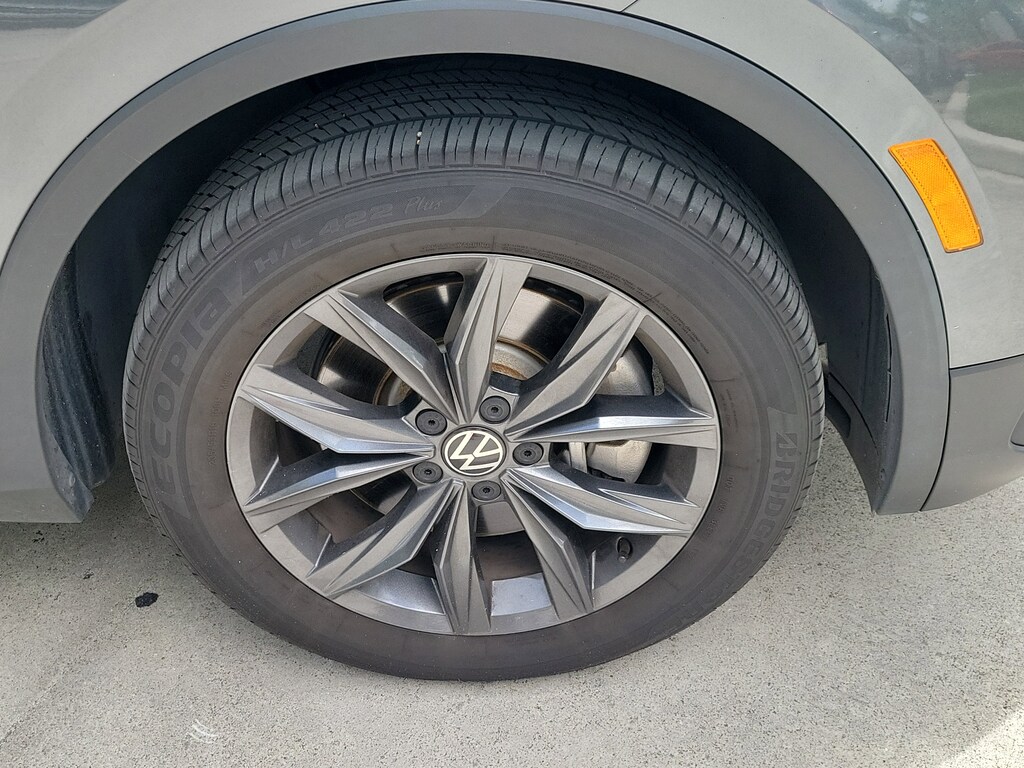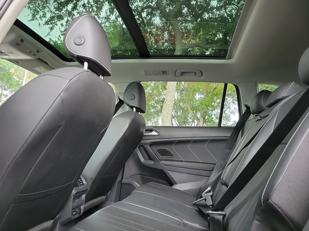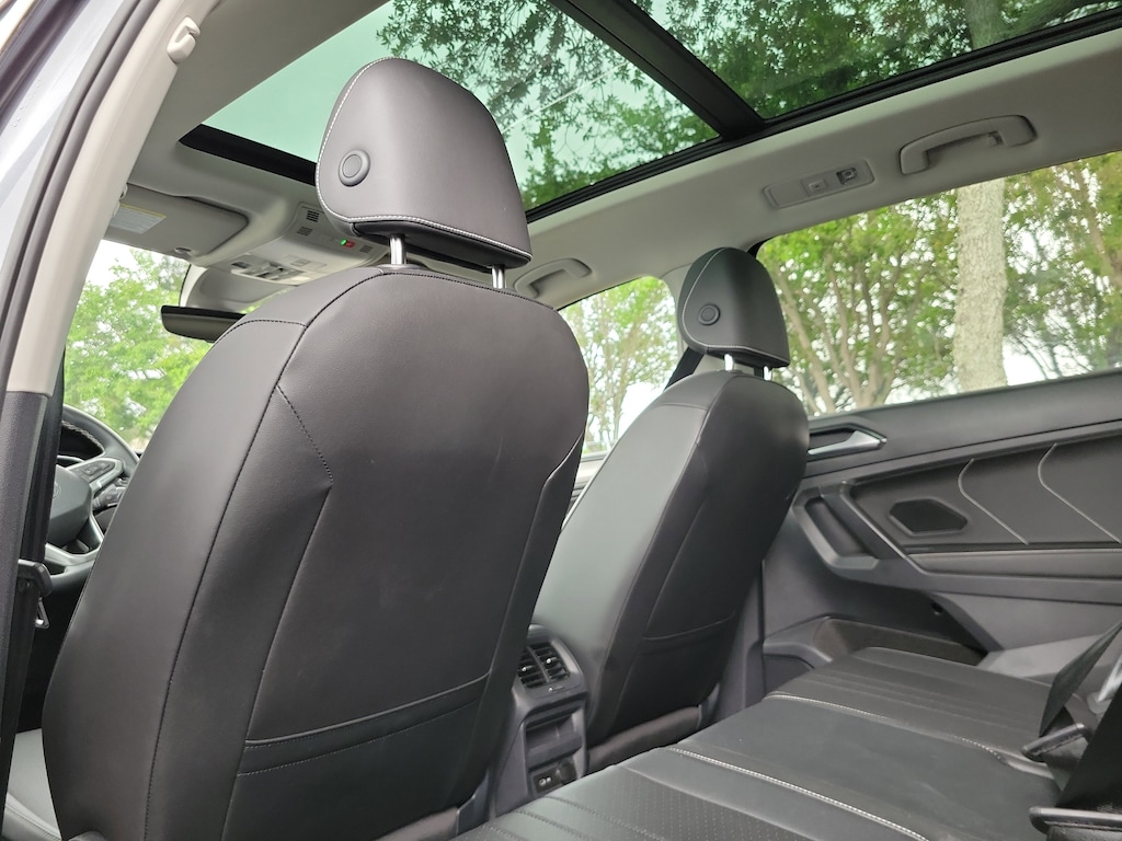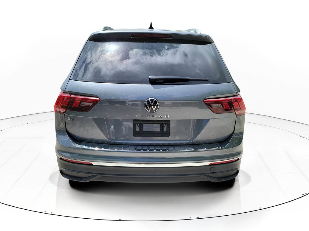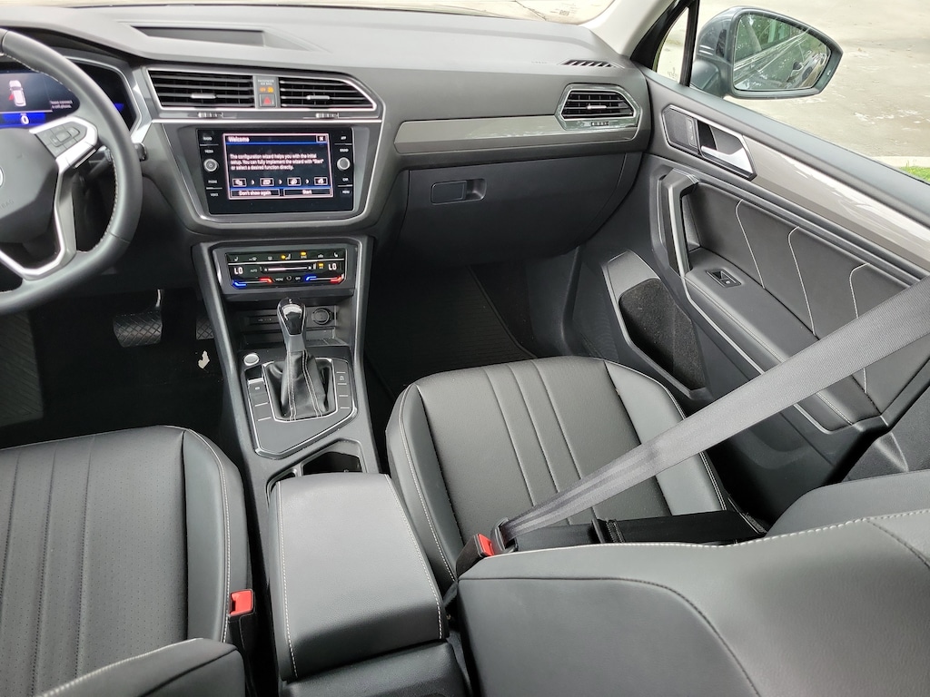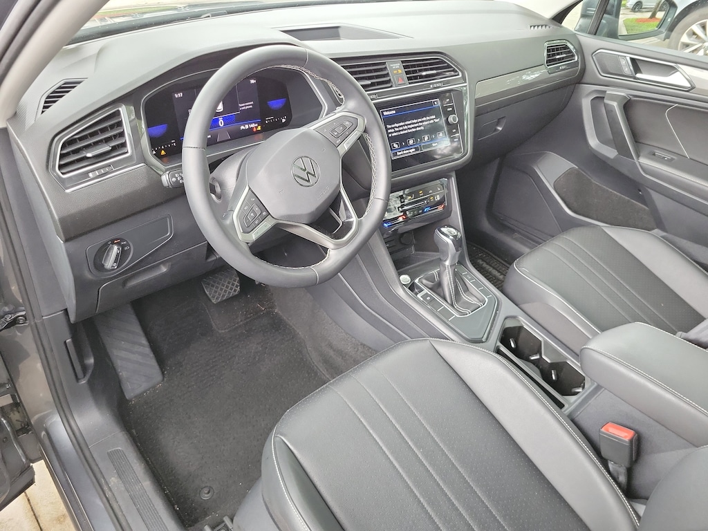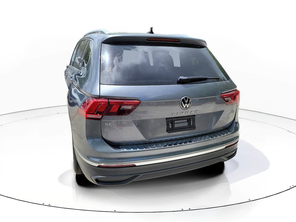 CARFAX One-Owner. Platinum Gray 2023 Volkswagen Tiguan 2.0T SE 2.0L TSI DOHC 8-Speed Automatic with Tiptronic FWD 3.33 Axle Ratio, 3rd row seats: bench, 4-Wheel Disc Brakes, 4-Wheel Independent Suspension, 6 Speakers, ABS brakes, Air Conditioning, Alloy wheels, AM/FM radio: SiriusXM with 360L, Auto-dimming Rear-View mirror, Automatic temperature control, Brake assist, Bumpers: body-color, Compass, Delay-off headlights, Driver door bin, Driver vanity mirror, Dual front impact airbags, Dual front side impact airbags, Electronic Stability Control, Emergency communication system: VW Car-Net Safe & Secure 5-year, Exterior Parking Camera Rear, Four wheel independent suspension, Front anti-roll bar, Front Bucket Seats, Front Center Armrest, Front dual zone A/C, Front reading lights, Fully automatic headlights, Heated door mirrors, Heated Front Comfort Seats, Heated front seats, Illuminated entry, Leather Shift Knob, Low tire pressure warning, Occupant sensing airbag, Outside temperature display, Overhead airbag, Overhead console, Panic alarm, Passenger door bin, Passenger vanity mirror, Perforated V-Tex Leatherette Seating Surfaces, Power door mirrors, Power driver seat, Power Liftgate, Power steering, Power windows, Radio data system, Radio: MIB3 Composition Media AM/FM/HD, Rain sensing wipers, Rear anti-roll bar, Rear reading lights, Rear seat center armrest, Rear window defroster, Rear window wiper, Remote keyless entry, Security system, Speed control, Speed-sensing steering, Split folding rear seat, Spoiler, Steering wheel mounted audio controls, Tachometer, Telescoping steering wheel, Tilt steering wheel, Traction control, Trip computer, Turn signal indicator mirrors, Variably intermittent wipers, and Wheels: 18" Dark Graphite Painted 10-Spoke Alloy.