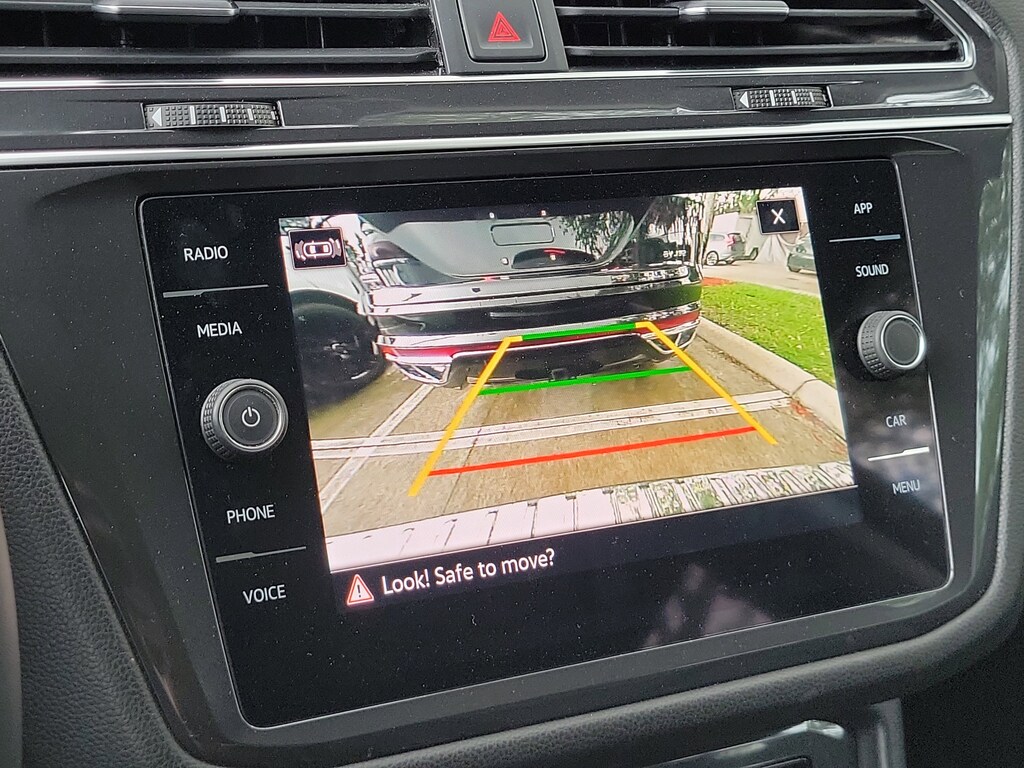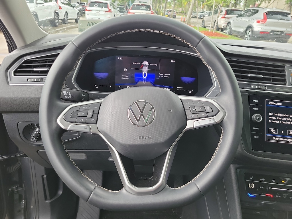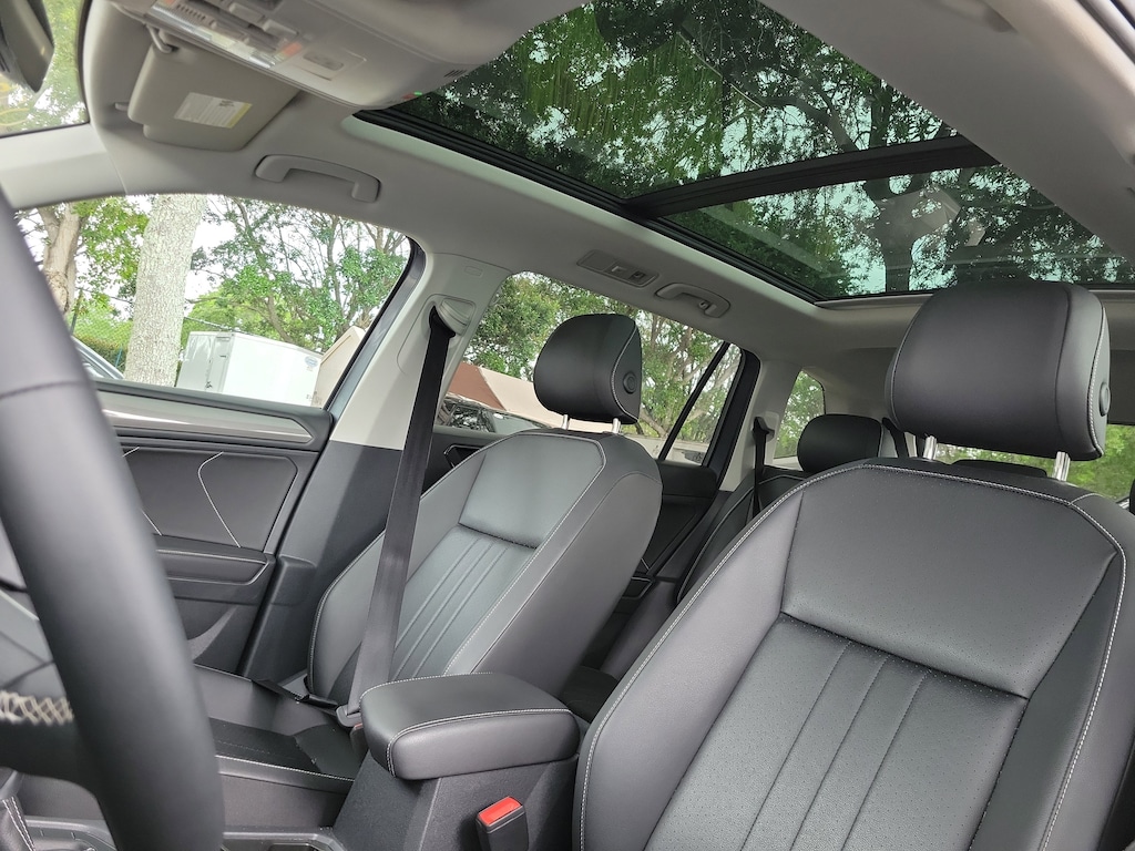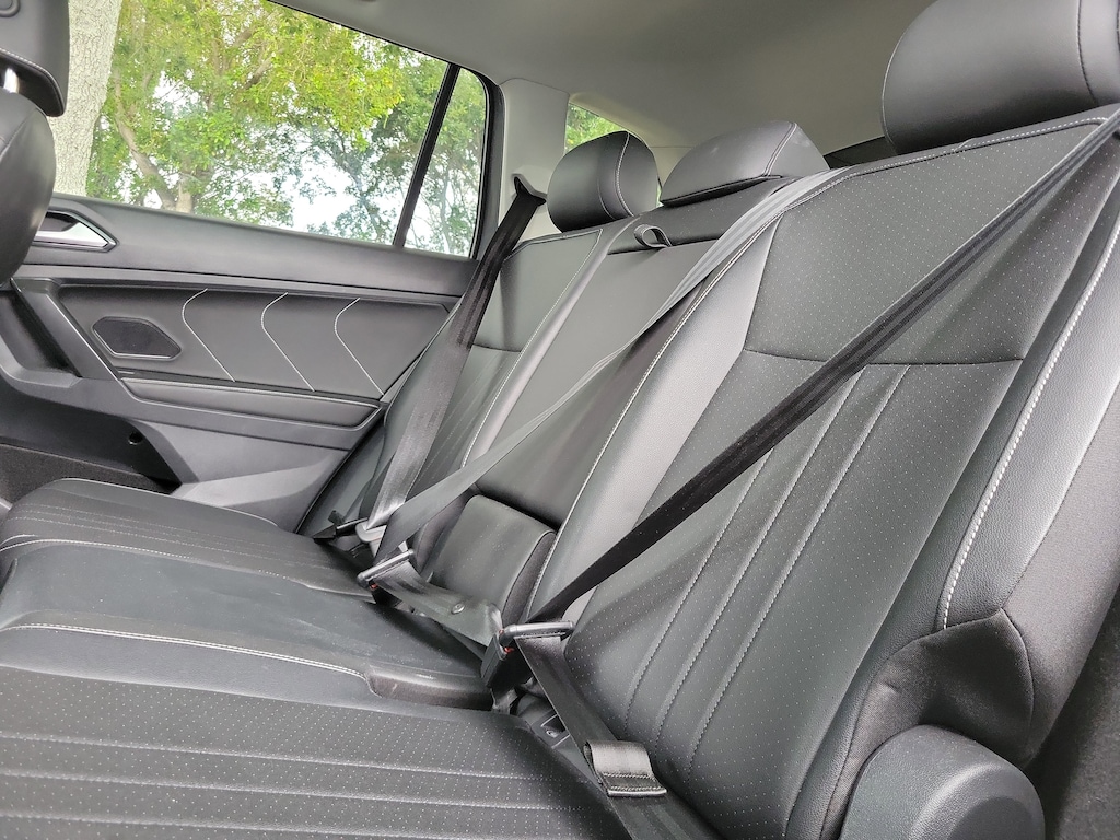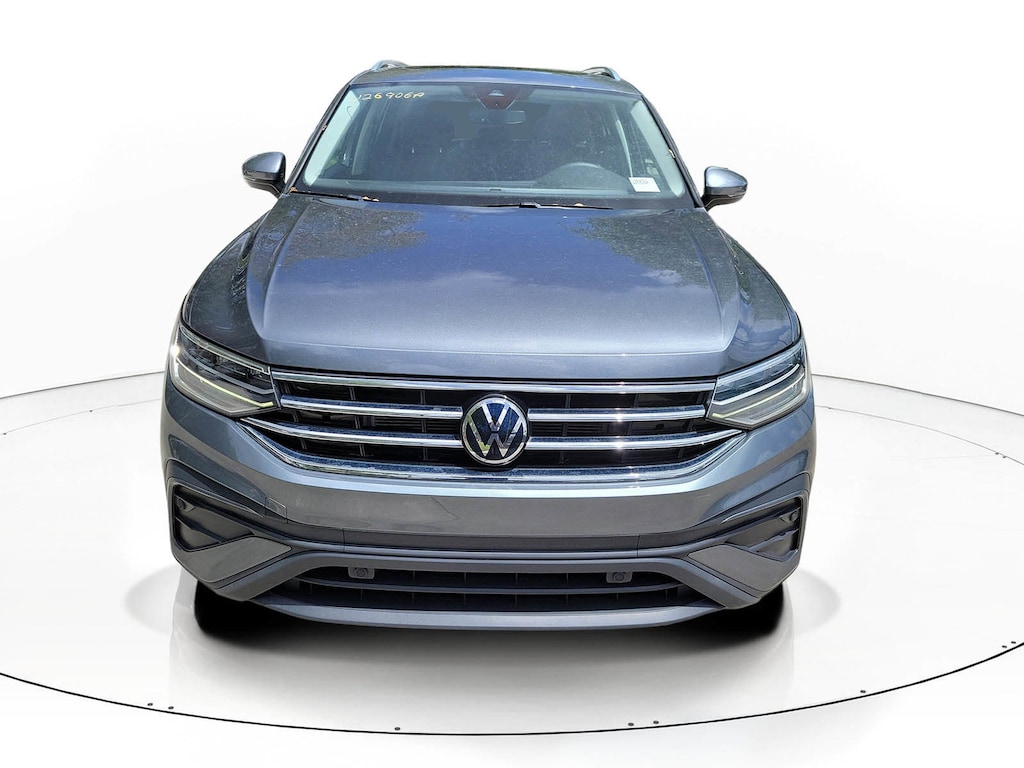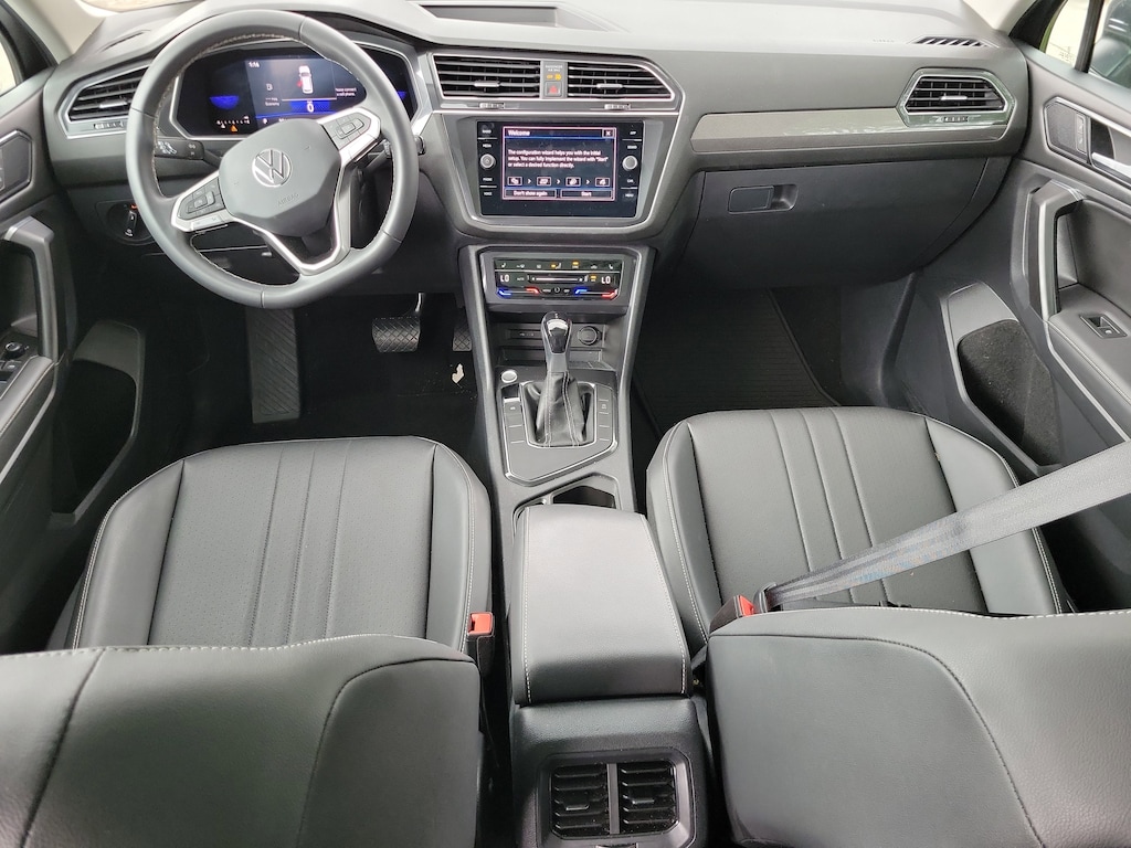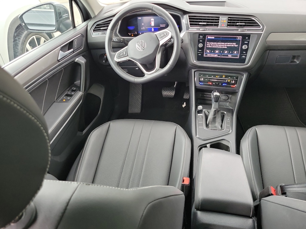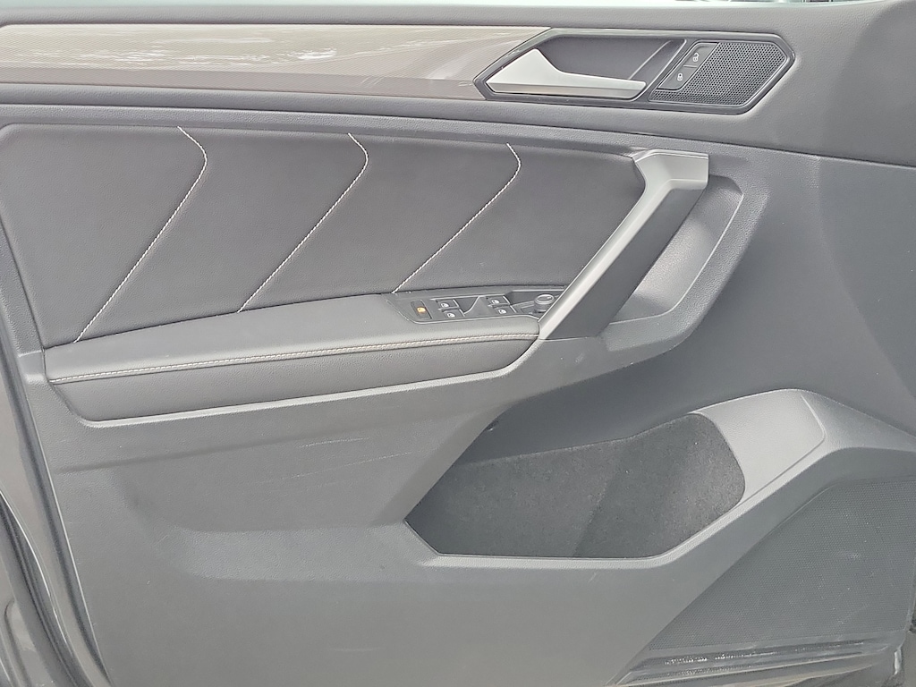 CARFAX One-Owner. Platinum Gray 2023 Volkswagen Tiguan 2.0T SE 2.0L TSI DOHC 8-Speed Automatic with Tiptronic FWD 3.33 Axle Ratio, 3rd row seats: bench, 4-Wheel Disc Brakes, 4-Wheel Independent Suspension, 6 Speakers, ABS brakes, Air Conditioning, Alloy wheels, AM/FM radio: SiriusXM with 360L, Auto-dimming Rear-View mirror, Automatic temperature control, Brake assist, Bumpers: body-color, Compass, Delay-off headlights, Driver door bin, Driver vanity mirror, Dual front impact airbags, Dual front side impact airbags, Electronic Stability Control, Emergency communication system: VW Car-Net Safe & Secure 5-year, Exterior Parking Camera Rear, Four wheel independent suspension, Front anti-roll bar, Front Bucket Seats, Front Center Armrest, Front dual zone A/C, Front reading lights, Fully automatic headlights, Heated door mirrors, Heated Front Comfort Seats, Heated front seats, Illuminated entry, Leather Shift Knob, Low tire pressure warning, Occupant sensing airbag, Outside temperature display, Overhead airbag, Overhead console, Panic alarm, Passenger door bin, Passenger vanity mirror, Perforated V-Tex Leatherette Seating Surfaces, Power door mirrors, Power driver seat, Power Liftgate, Power steering, Power windows, Radio data system, Radio: MIB3 Composition Media AM/FM/HD, Rain sensing wipers, Rear anti-roll bar, Rear reading lights, Rear seat center armrest, Rear window defroster, Rear window wiper, Remote keyless entry, Security system, Speed control, Speed-sensing steering, Split folding rear seat, Spoiler, Steering wheel mounted audio controls, Tachometer, Telescoping steering wheel, Tilt steering wheel, Traction control, Trip computer, Turn signal indicator mirrors, Variably intermittent wipers, and Wheels: 18" Dark Graphite Painted 10-Spoke Alloy.
