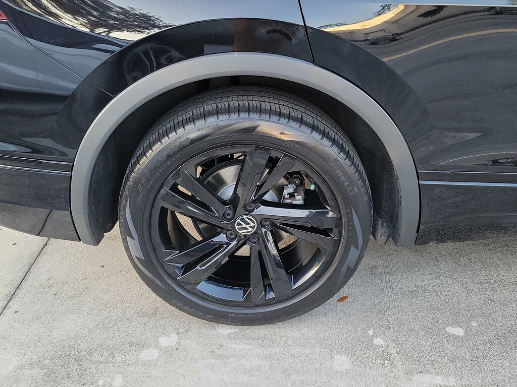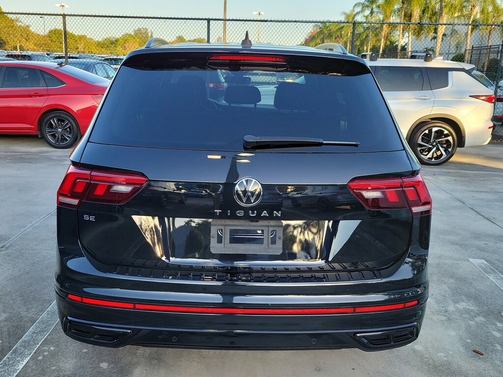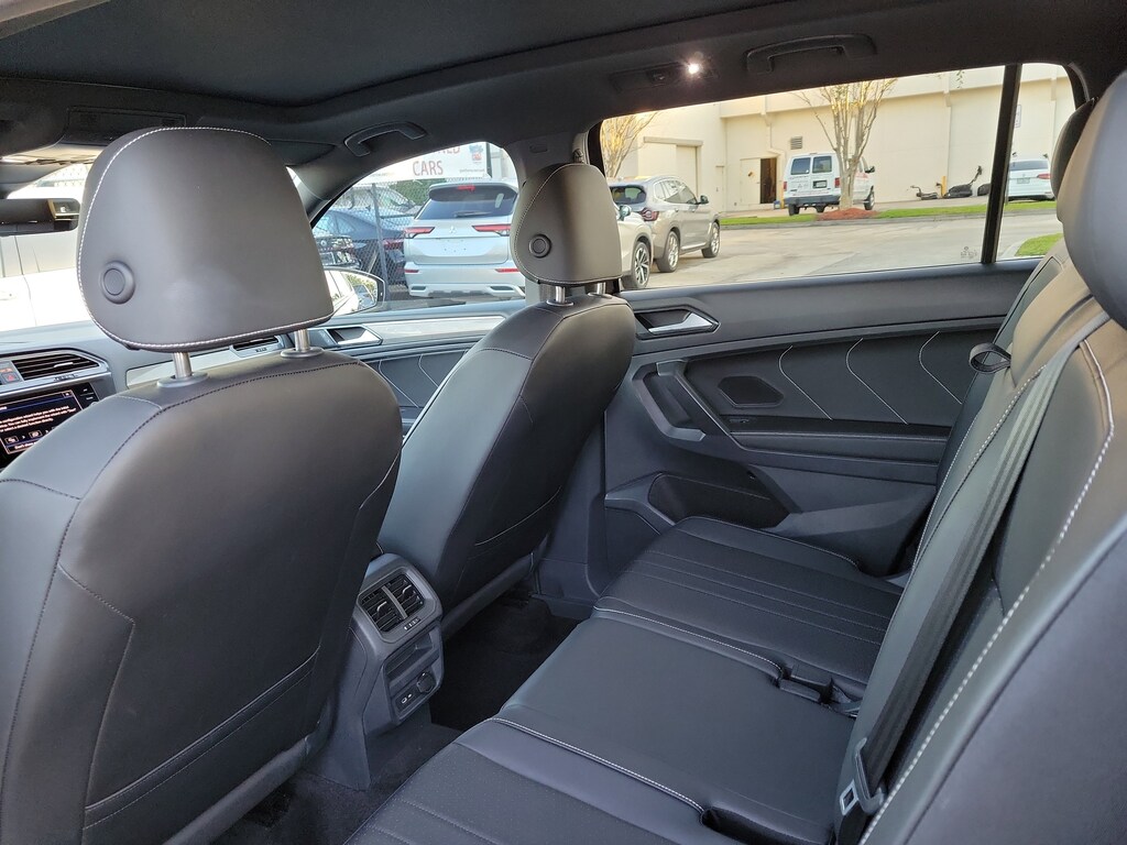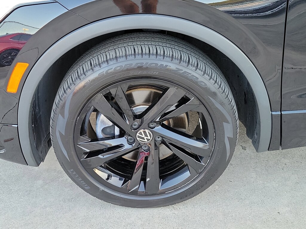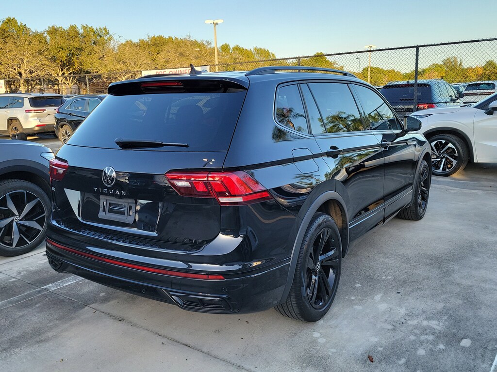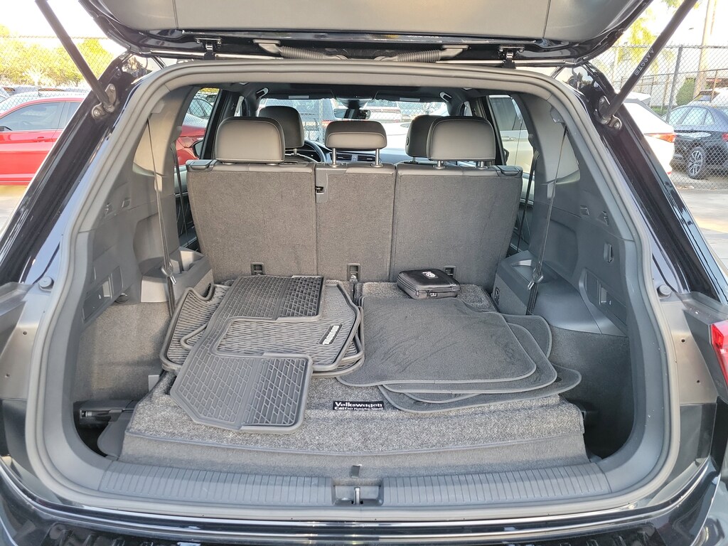 CARFAX One-Owner. Deep Black 2023 Volkswagen Tiguan 2.0T SE R-Line Black 2.0L TSI DOHC 8-Speed Automatic with Tiptronic FWD 3-Row Rubber Monster Mats w/Logo Kit (Set of 5), 3.33 Axle Ratio, 3rd row seats: bench, 4-Wheel Disc Brakes, 4-Wheel Independent Suspension, 6 Speakers, ABS brakes, Air Conditioning, Alloy wheels, AM/FM radio: SiriusXM with 360L, Auto-dimming Rear-View mirror, Auto-Dimming Rearview Mirror w/HomeLink Connect, Automatic temperature control, Brake assist, Bumpers: body-color, Cargo Area Retractable Privacy Cover, Compass, Credit - Power Rear Liftgate Removed, Credit - Steering Wheel Substitution, Delay-off headlights, Driver door bin, Driver vanity mirror, Dual front impact airbags, Dual front side impact airbags, Electronic Stability Control, Emergency communication system: VW Car-Net Safe & Secure 5-year, Exterior Parking Camera Rear, First Aid Kit, Four wheel independent suspension, Front anti-roll bar, Front Bucket Seats, Front Center Armrest, Front dual zone A/C, Front reading lights, Fully automatic headlights, Heated door mirrors, Heated Front Comfort Seats, Heated front seats, Heavy Duty Trunk Liner w/VW CarGo Blocks, Illuminated entry, Leather Shift Knob, Leather steering wheel, Low tire pressure warning, Occupant sensing airbag, Outside temperature display, Overhead airbag, Overhead console, Panic alarm, Passenger door bin, Passenger vanity mirror, Perforated V-Tex Leatherette Seating Surfaces, Power door mirrors, Power driver seat, Power Liftgate, Power moonroof, Power steering, Power windows, Radio data system, Radio: MIB3 Composition Media AM/FM/HD, Rain sensing wipers, Rear anti-roll bar, Rear reading lights, Rear seat center armrest, Rear window defroster, Rear window wiper, Remote keyless entry, Roadside Assistance Kit, Roof Rack Base Carrier Bars (Set of 2), Security system, Speed control, Speed-sensing steering, Split folding rear seat, Spoiler, Sport steering wheel, Steering wheel mounted audio controls, Tachometer, Telescoping steering wheel, Tilt steering wheel, Traction control, Trip computer, Turn signal indicator mirrors, Variably intermittent wipers, and Wheels: 19" Black Painted Twin 5-Spoke Alloy.