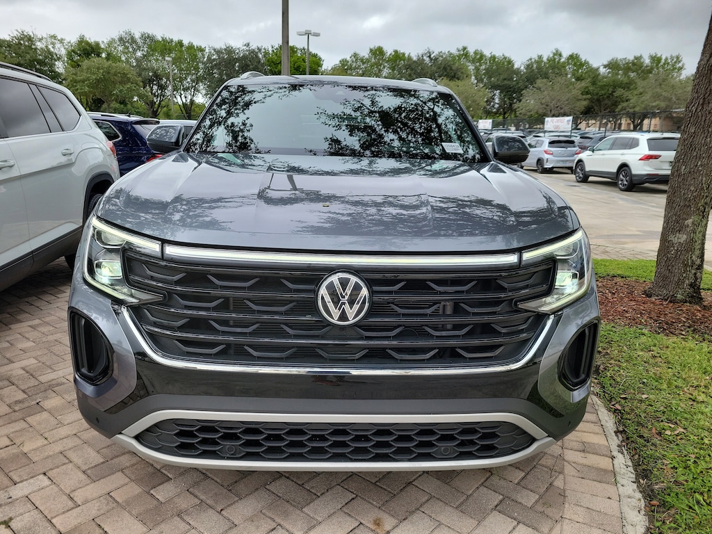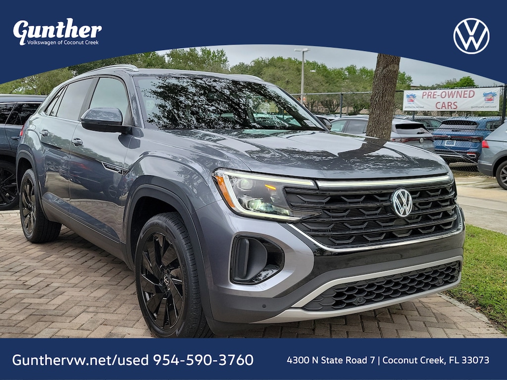 CARFAX One-Owner. Platinum Gray 2024 Volkswagen Atlas Cross Sport 2.0T SE w/Technology 2.0L TSI 8-Speed Automatic with Tiptronic FWD 3.60 Axle Ratio, 4-Wheel Disc Brakes, 4-Wheel Independent Suspension, 6 Speakers, ABS brakes, Air Conditioning, Alloy wheels, AM/FM radio: SiriusXM with 360L, Auto-dimming Rear-View mirror, Automatic temperature control, Brake assist, Bumpers: body-color, Compass, Delay-off headlights, Driver door bin, Driver vanity mirror, Dual front impact airbags, Dual front side impact airbags, Electronic Stability Control, Emergency communication system: VW Car-Net Safe & Secure 5-year, Exterior Parking Camera Rear, Four wheel independent suspension, Front anti-roll bar, Front Bucket Seats, Front Center Armrest, Front dual zone A/C, Front fog lights, Front reading lights, Fully automatic headlights, Heated & Actively Ventilated Front Seats, Heated door mirrors, Heated front seats, Heated steering wheel, Illuminated entry, Low tire pressure warning, Occupant sensing airbag, Outside temperature display, Overhead airbag, Overhead console, Panic alarm, Passenger door bin, Passenger vanity mirror, Perforated V-Tex Leatherette Seating Surfaces, Power door mirrors, Power driver seat, Power Liftgate, Power steering, Power windows, Radio data system, Radio: MIB3 Composition Media AM/FM/HD, Rain sensing wipers, Rear anti-roll bar, Rear reading lights, Rear seat center armrest, Rear window defroster, Rear window wiper, Remote keyless entry, Security system, Speed control, Speed-sensing steering, Split folding rear seat, Spoiler, Steering wheel mounted audio controls, Tachometer, Telescoping steering wheel, Tilt steering wheel, Traction control, Trip computer, Turn signal indicator mirrors, Variably intermittent wipers, Ventilated front seats, and Wheels: 20" 5-Spoke 2-Tone Machined Alloy.