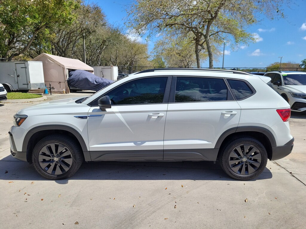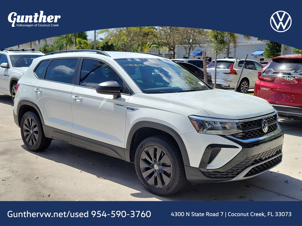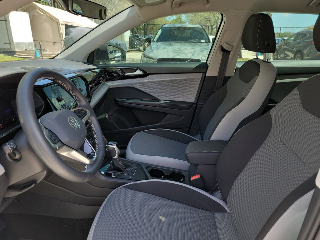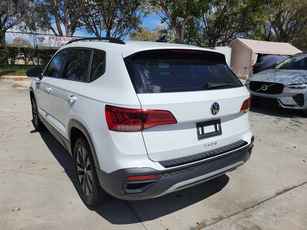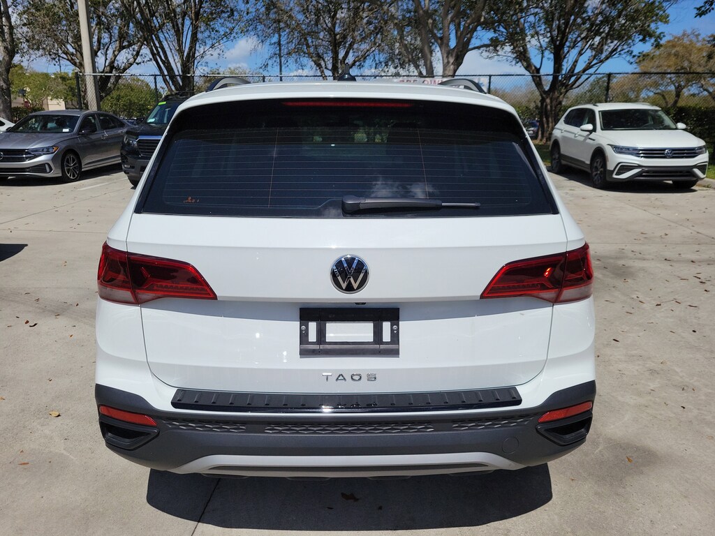 CARFAX One-Owner. Pure White 2024 Volkswagen Taos 1.5T S 1.5L I4 Turbocharged DOHC 16V LEV3-SULEV30 158hp 8-Speed Automatic with Tiptronic FWD 3.23 Axle Ratio, 4-Wheel Disc Brakes, 6 Speakers, ABS brakes, Active Blind Spot Monitor, Air Conditioning, Alloy wheels, AM/FM radio, Auto High-beam Headlights, Brake assist, Bumpers: body-color, Cloth Seating Surfaces, Compass, Delay-off headlights, Driver door bin, Driver vanity mirror, Dual front impact airbags, Dual front side impact airbags, Electronic Stability Control, Emergency communication system: VW Car-Net Safe & Secure 5-year, Exterior Parking Camera Rear, Front anti-roll bar, Front Bucket Seats, Front Center Armrest, Front reading lights, Front Strut Rear Torsion Beam Suspension, Front wheel independent suspension, Fully automatic headlights, Heated steering wheel, Illuminated entry, Leather Shift Knob, Low tire pressure warning, Occupant sensing airbag, Outside temperature display, Overhead airbag, Overhead console, Panic alarm, Passenger door bin, Passenger vanity mirror, Power door mirrors, Power steering, Power windows, Radio data system, Radio: Composition Color AM/FM, Rain sensing wipers, Rear anti-roll bar, Rear seat center armrest, Rear window defroster, Rear window wiper, Remote keyless entry, Roof rack: rails only, Speed control, Speed-sensing steering, Split folding rear seat, Spoiler, Steering wheel mounted audio controls, Tachometer, Telescoping steering wheel, Tilt steering wheel, Traction control, Trip computer, Variably intermittent wipers, and Wheels: 17" Silver Painted Alloy.