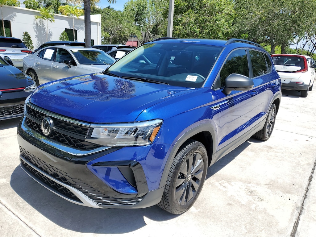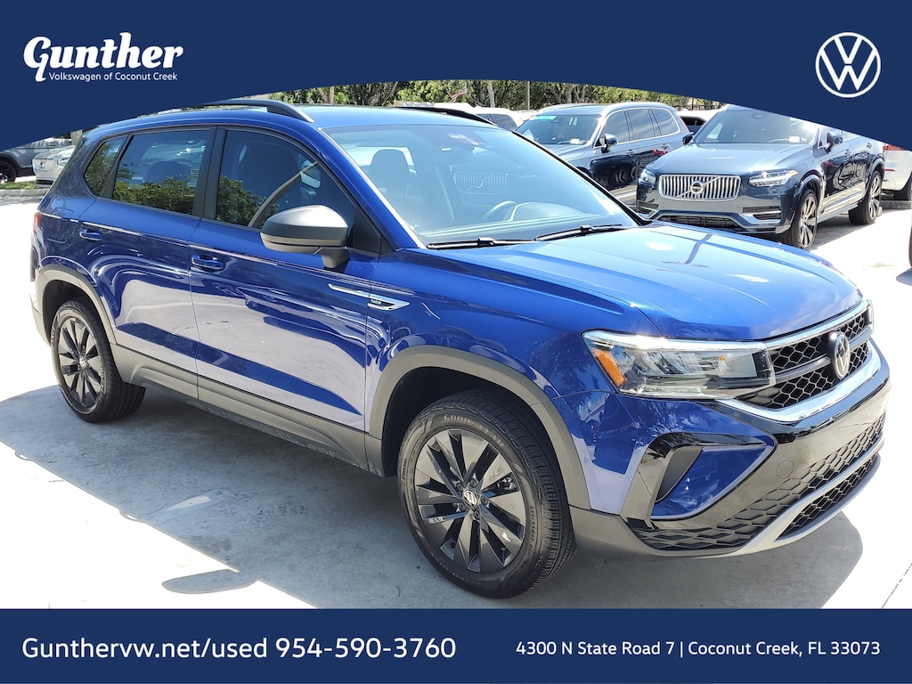 CARFAX One-Owner. Certified. Blue Metallic 2024 Volkswagen Taos 1.5T S 1.5L I4 Turbocharged DOHC 16V LEV3-SULEV30 158hp 8-Speed Automatic with Tiptronic FWD 3.23 Axle Ratio, 4-Wheel Disc Brakes, 6 Speakers, ABS brakes, Active Blind Spot Monitor, Air Conditioning, Alloy wheels, AM/FM radio, Auto High-beam Headlights, Brake assist, Bumpers: body-color, Cloth Seating Surfaces, Compass, Delay-off headlights, Driver door bin, Driver vanity mirror, Dual front impact airbags, Dual front side impact airbags, Electronic Stability Control, Emergency communication system: VW Car-Net Safe & Secure 5-year, Exterior Parking Camera Rear, Front anti-roll bar, Front Bucket Seats, Front Center Armrest, Front reading lights, Front Strut Rear Torsion Beam Suspension, Front wheel independent suspension, Fully automatic headlights, Heated steering wheel, Illuminated entry, Leather Shift Knob, Low tire pressure warning, Occupant sensing airbag, Outside temperature display, Overhead airbag, Overhead console, Panic alarm, Passenger door bin, Passenger vanity mirror, Power door mirrors, Power steering, Power windows, Radio data system, Radio: Composition Color AM/FM, Rain sensing wipers, Rear anti-roll bar, Rear seat center armrest, Rear window defroster, Rear window wiper, Remote keyless entry, Roof rack: rails only, Rubber Mats Kit (SNM), Speed control, Speed-sensing steering, Split folding rear seat, Spoiler, Steering wheel mounted audio controls, Tachometer, Telescoping steering wheel, Tilt steering wheel, Traction control, Trip computer, Variably intermittent wipers, and Wheels: 17" Silver Painted Alloy.