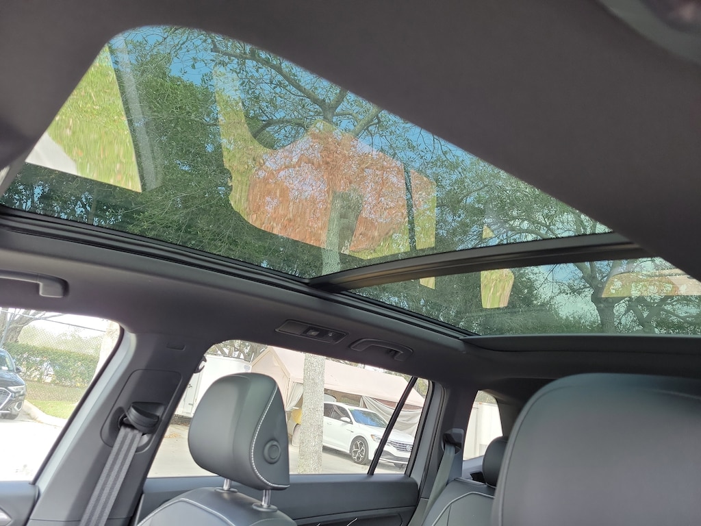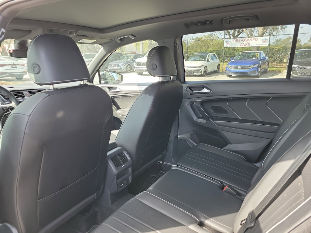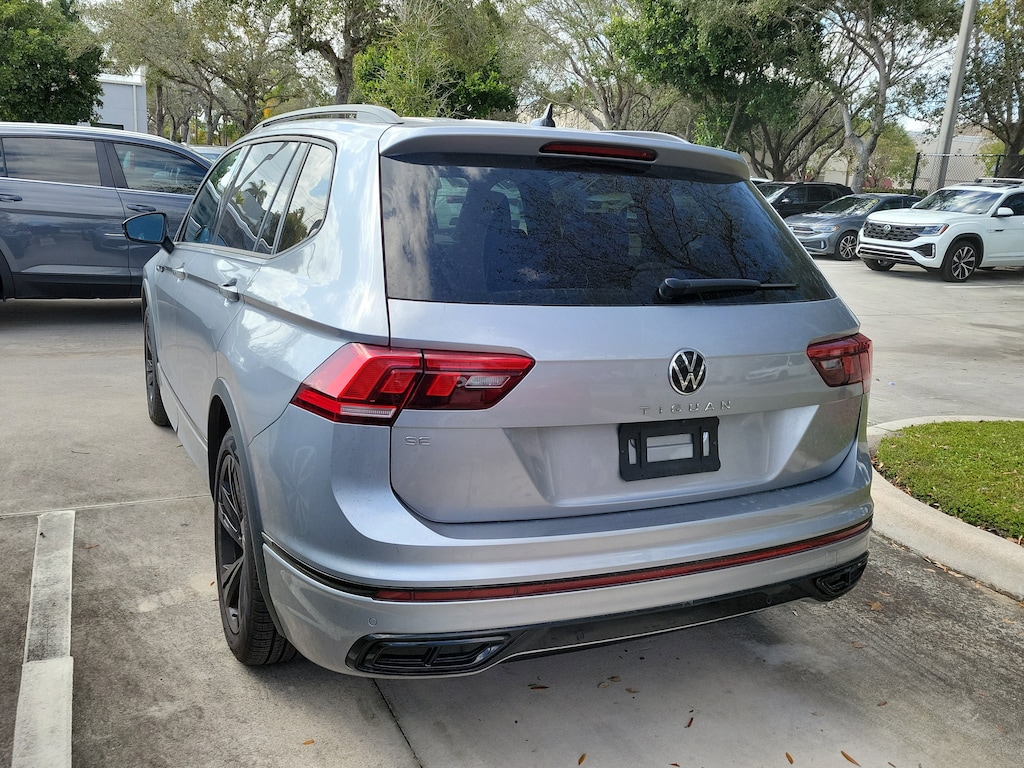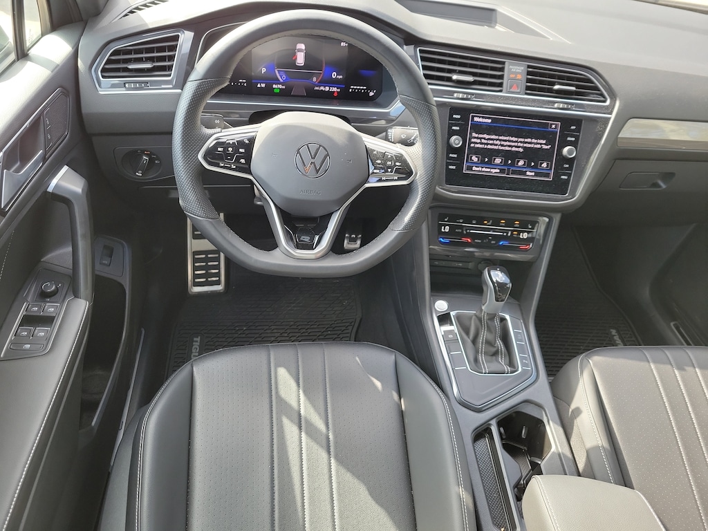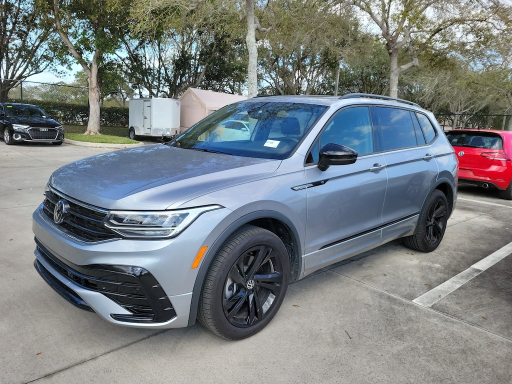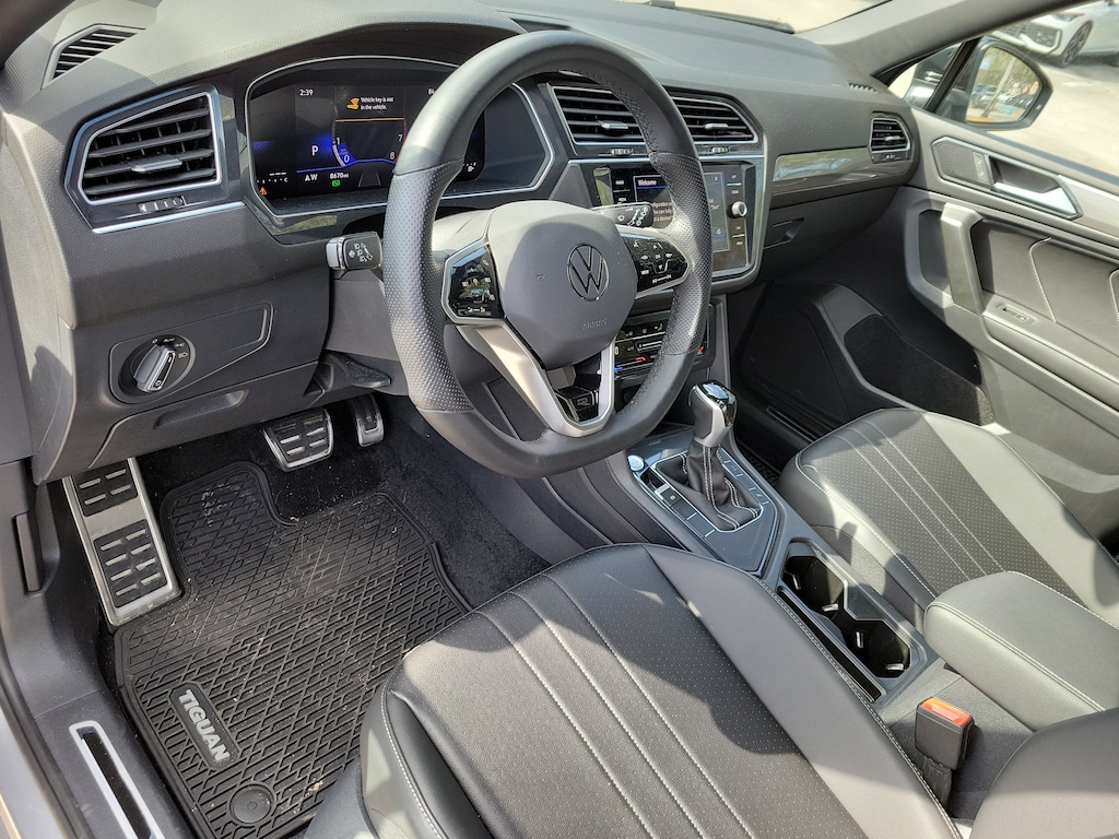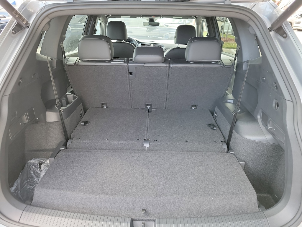 CARFAX One-Owner. Silver Metallic 2024 Volkswagen Tiguan 2.0T SE R-Line Black 2.0L TSI DOHC 8-Speed Automatic with Tiptronic FWD 3-Row Rubber Monster Mats (Set of 5), 3.33 Axle Ratio, 3rd row seats: bench, 4-Wheel Disc Brakes, 4-Wheel Independent Suspension, 6 Speakers, ABS brakes, Air Conditioning, Alloy wheels, AM/FM radio: SiriusXM with 360L, Auto-dimming Rear-View mirror, Automatic temperature control, Brake assist, Bumpers: body-color, Compass, Delay-off headlights, Driver door bin, Driver vanity mirror, Dual front impact airbags, Dual front side impact airbags, Electronic Stability Control, Emergency communication system: VW Car-Net Safe & Secure 5-year, Exterior Parking Camera Rear, Four wheel independent suspension, Front anti-roll bar, Front Bucket Seats, Front Center Armrest, Front dual zone A/C, Front reading lights, Fully automatic headlights, Heated door mirrors, Heated Front Seats, Heated front seats, Illuminated entry, Leather Shift Knob, Leather steering wheel, Low tire pressure warning, Occupant sensing airbag, Outside temperature display, Overhead airbag, Overhead console, Panic alarm, Passenger door bin, Passenger vanity mirror, Perforated V-Tex Leatherette Seating Surfaces, Power door mirrors, Power driver seat, Power Liftgate, Power moonroof, Power steering, Power windows, Radio data system, Radio: MIB3 Composition Media AM/FM/HD, Rain sensing wipers, Rear anti-roll bar, Rear reading lights, Rear seat center armrest, Rear window defroster, Rear window wiper, Remote keyless entry, Security system, Speed control, Speed-sensing steering, Split folding rear seat, Spoiler, Sport steering wheel, Steering wheel mounted audio controls, Tachometer, Telescoping steering wheel, Tilt steering wheel, Traction control, Trip computer, Turn signal indicator mirrors, Variably intermittent wipers, and Wheels: 19" Black Painted Twin 5-Spoke Alloy.