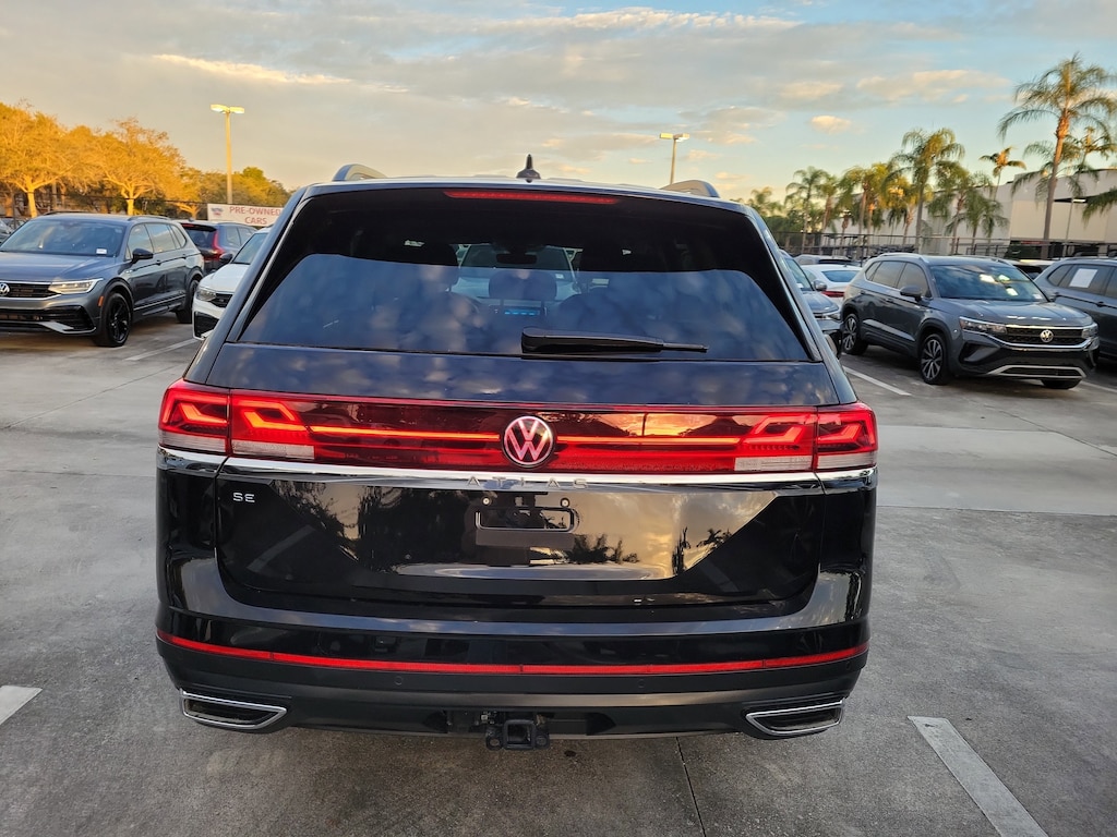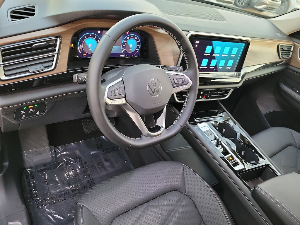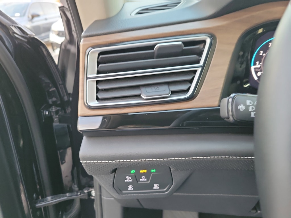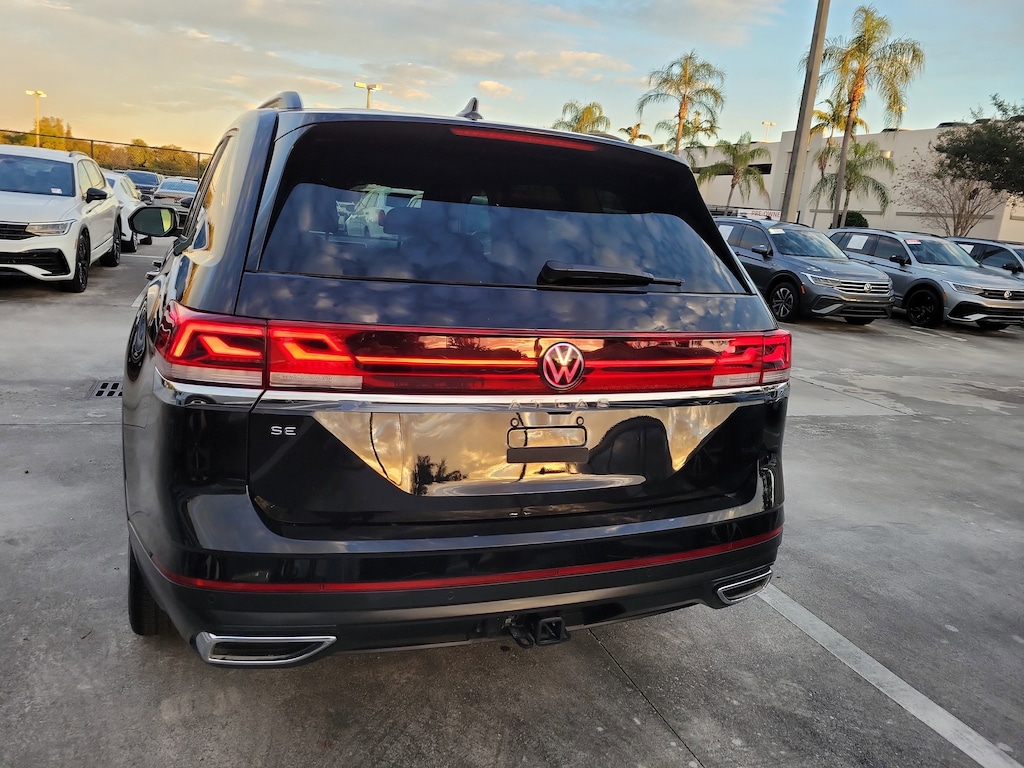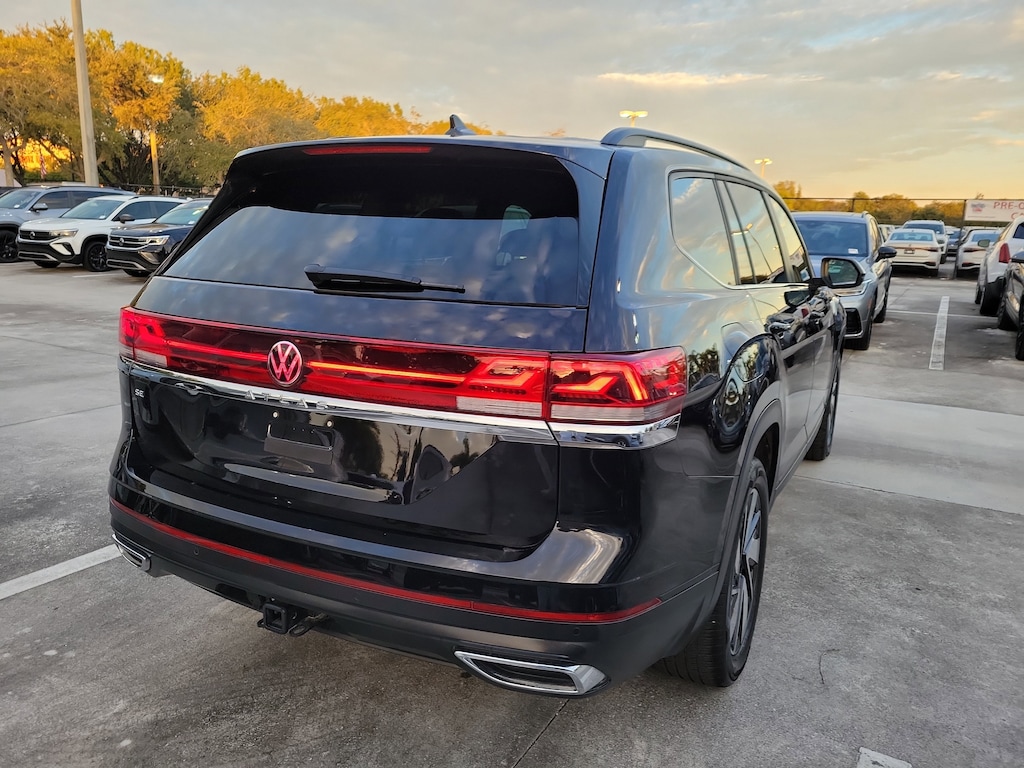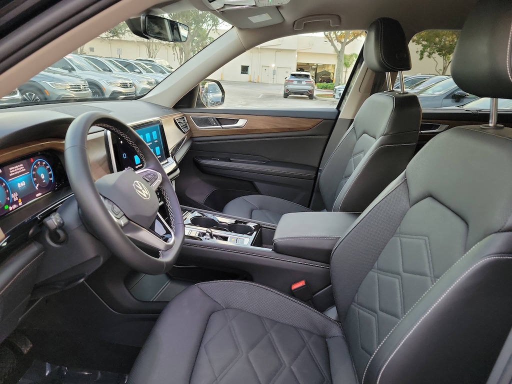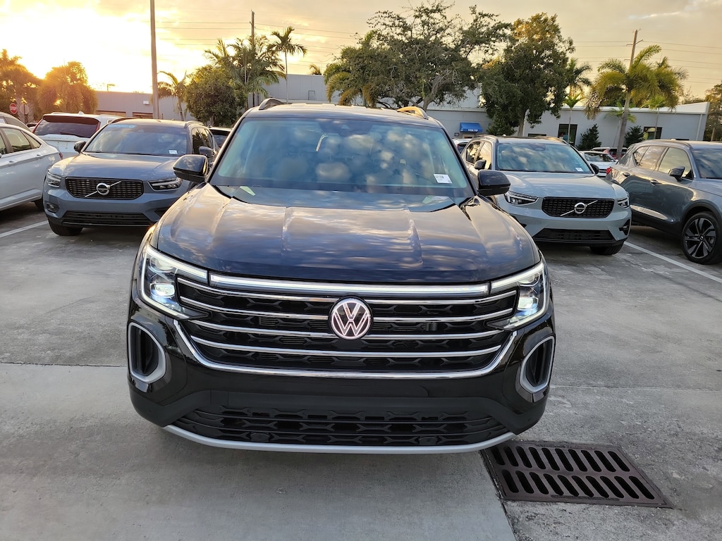 CARFAX One-Owner. Deep Black 2025 Volkswagen Atlas 2.0T SE w/Technology 2.0L TSI 8-Speed Automatic FWD 20" 2-tone machined alloy wheels, 3rd row seats: split-bench, 4-Wheel Disc Brakes, 6 Speakers, ABS brakes, Air Conditioning, Alloy wheels, AM/FM radio: SiriusXM with 360L, Auto High-beam Headlights, Auto-dimming Rear-View mirror, Automatic temperature control, Brake assist, Bumpers: body-color, Compass, Delay-off headlights, Driver door bin, Driver vanity mirror, Dual front impact airbags, Dual front side impact airbags, Electronic Stability Control, Emergency communication system: VW Car-Net Safe & Secure 5-year, Exterior Parking Camera Rear, Four wheel independent suspension, four-wheel independent suspension, Front anti-roll bar, Front Bucket Seats, Front Center Armrest, Front dual zone A/C, Front fog lights, Front reading lights, Fully automatic headlights, heated and Actively ventilated front bucket seats, Heated door mirrors, Heated front seats, Heated steering wheel, Illuminated entry, Low tire pressure warning, MIB3 composition media radio, Occupant sensing airbag, Outside temperature display, Overhead airbag, Overhead console, Panic alarm, Passenger door bin, Passenger vanity mirror, perforated V-Tex leatherette seating surfaces, Power door mirrors, Power driver seat, Power Liftgate, Power steering, Power windows, Radio data system, Rain sensing wipers, Rear air conditioning, Rear anti-roll bar, Rear reading lights, Rear seat center armrest, Rear window defroster, Rear window wiper, Remote keyless entry, Security system, Speed control, Speed-sensing steering, Split folding rear seat, Spoiler, Steering wheel mounted audio controls, Tachometer, Telescoping steering wheel, Tilt steering wheel, Traction control, Trip computer, Turn signal indicator mirrors, Variably intermittent wipers, and Ventilated front seats.