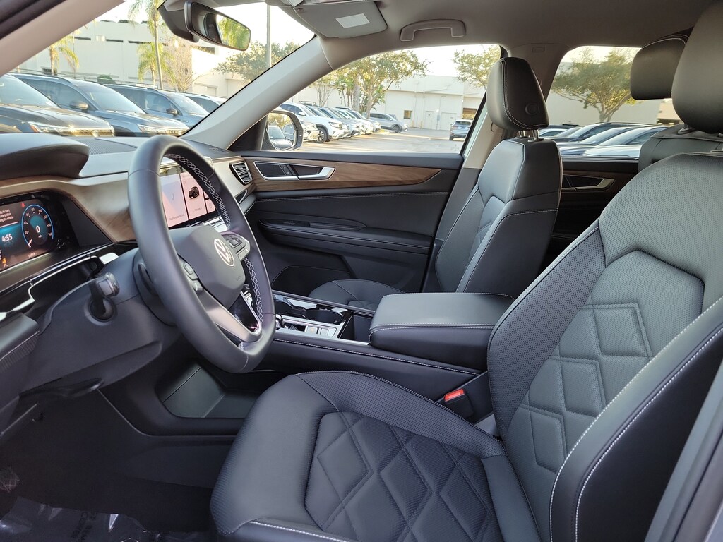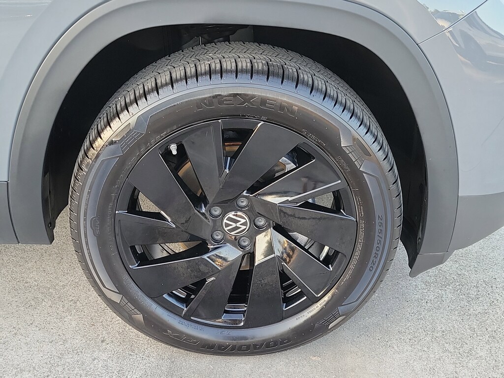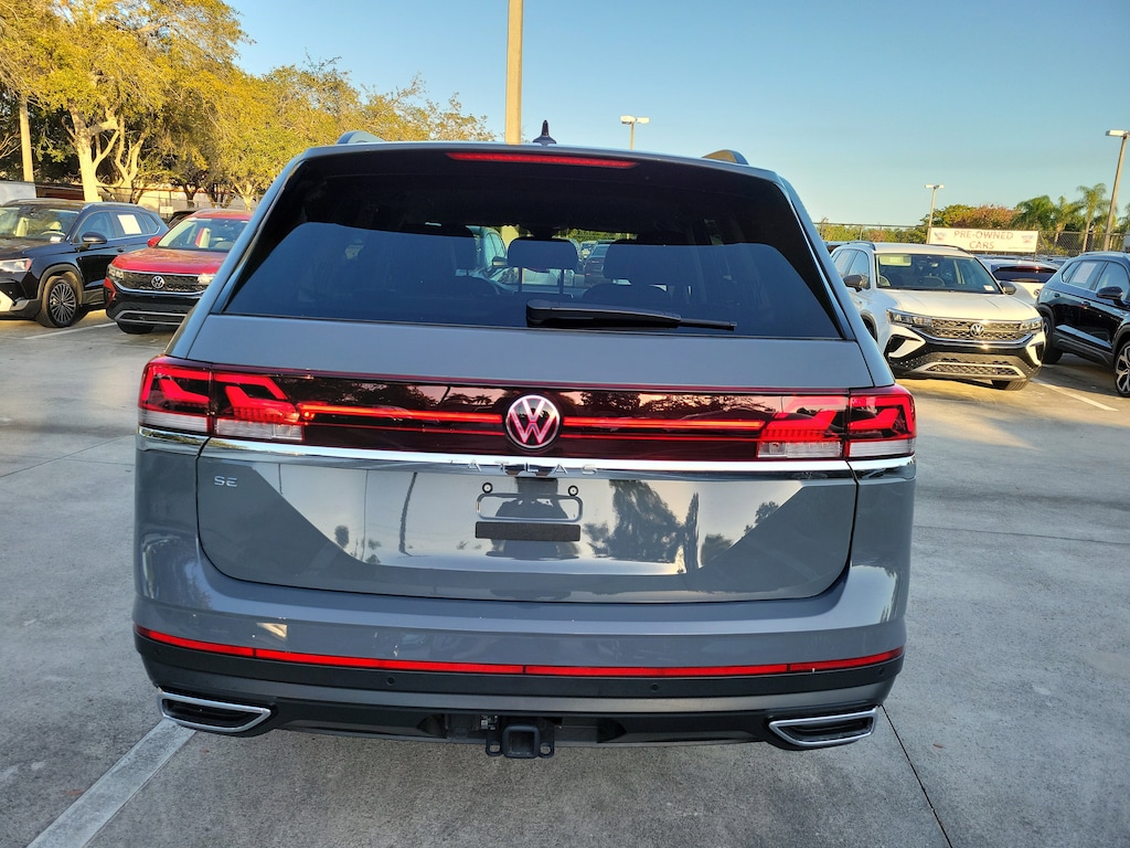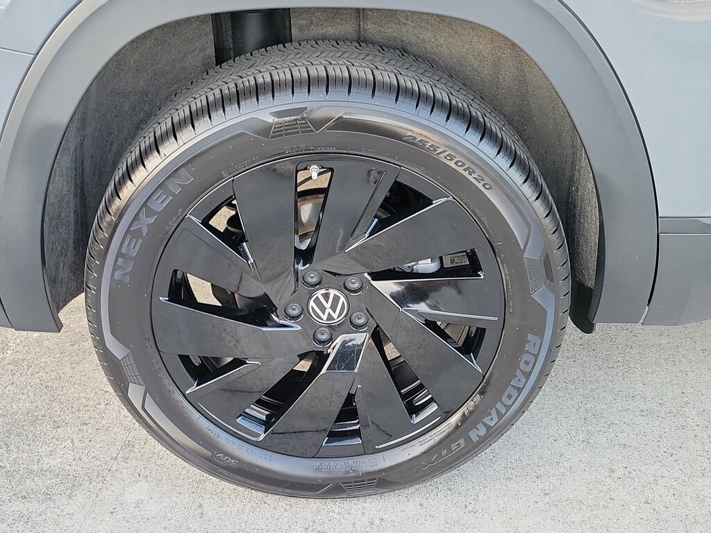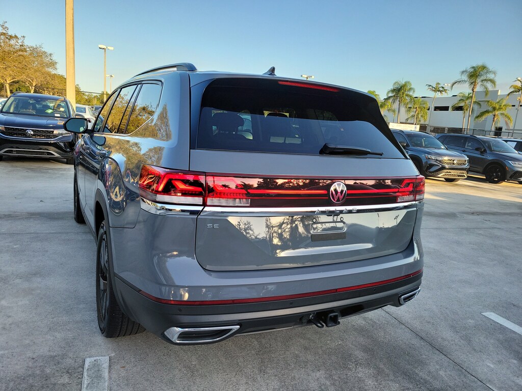 CARFAX One-Owner. Gray 2025 Volkswagen Atlas 2.0T SE w/Technology 2.0L TSI 8-Speed Automatic FWD Black wheel package (20" multi-spoke black painted alloy wheels), 20" 2-tone machined alloy wheels, 3rd row seats: split-bench, 4-Wheel Disc Brakes, 6 Speakers, ABS brakes, Air Conditioning, Alloy wheels, AM/FM radio: SiriusXM with 360L, Auto High-beam Headlights, Auto-dimming Rear-View mirror, Automatic temperature control, Brake assist, Bumpers: body-color, Compass, Delay-off headlights, Driver door bin, Driver vanity mirror, Dual front impact airbags, Dual front side impact airbags, Electronic Stability Control, Emergency communication system: VW Car-Net Safe & Secure 5-year, Exterior Parking Camera Rear, Four wheel independent suspension, four-wheel independent suspension, Front anti-roll bar, Front Bucket Seats, Front Center Armrest, Front dual zone A/C, Front fog lights, Front reading lights, Fully automatic headlights, heated and Actively ventilated front bucket seats, Heated door mirrors, Heated front seats, Heated steering wheel, Illuminated entry, Low tire pressure warning, MIB3 composition media radio, Occupant sensing airbag, Outside temperature display, Overhead airbag, Overhead console, Panic alarm, Passenger door bin, Passenger vanity mirror, perforated V-Tex leatherette seating surfaces, Power door mirrors, Power driver seat, Power Liftgate, Power steering, Power windows, Radio data system, Rain sensing wipers, Rear air conditioning, Rear anti-roll bar, Rear reading lights, Rear seat center armrest, Rear window defroster, Rear window wiper, Remote keyless entry, Security system, Speed control, Speed-sensing steering, Split folding rear seat, Spoiler, Steering wheel mounted audio controls, Tachometer, Telescoping steering wheel, Tilt steering wheel, Traction control, Trip computer, Turn signal indicator mirrors, Variably intermittent wipers, and Ventilated front seats.
