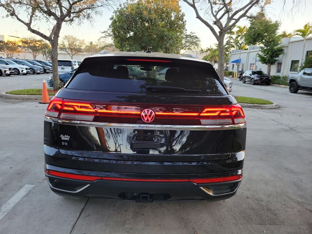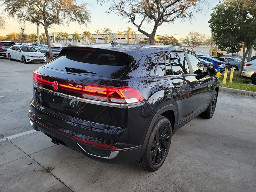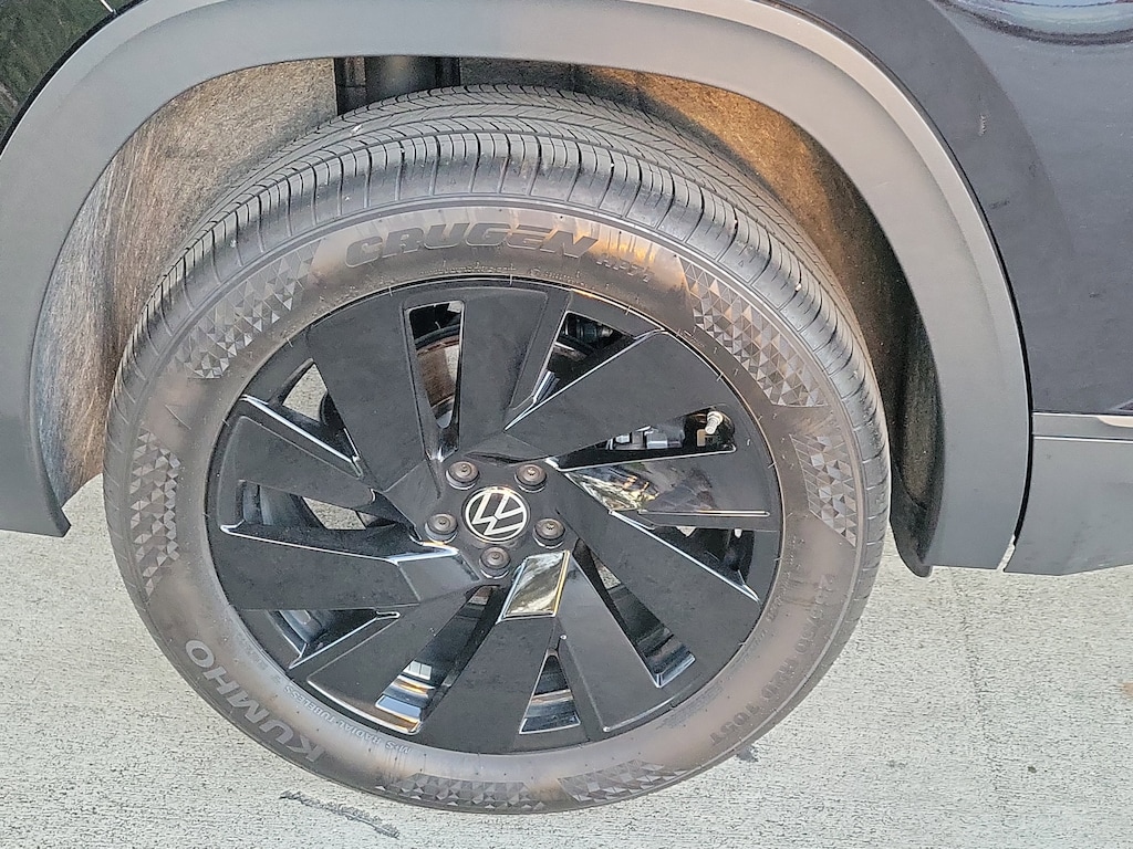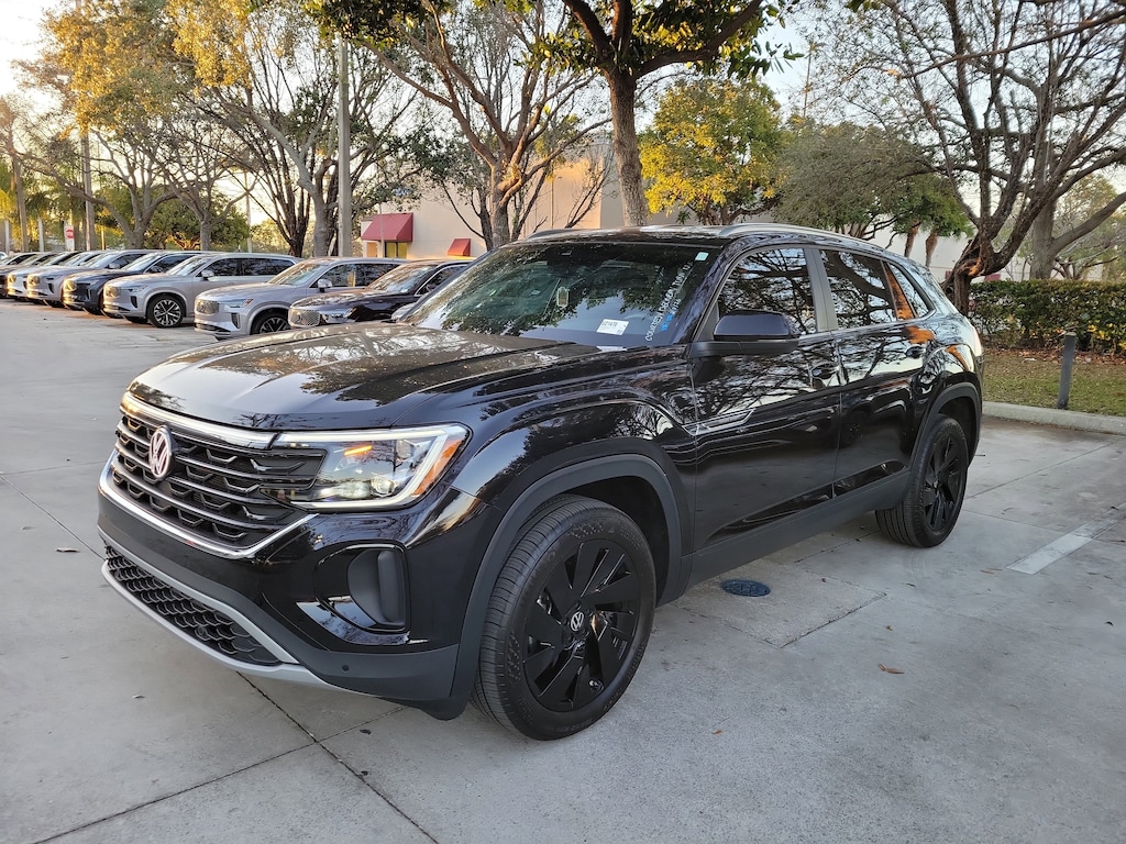 CARFAX One-Owner. Deep Black 2025 Volkswagen Atlas Cross Sport 2.0T SE w/Technology 2.0L TSI 8-Speed Automatic with Tiptronic FWD Black Wheel Package (Wheels: 20" Multi-Spoke Black Painted Alloy), 4-Wheel Disc Brakes, 4-Wheel Independent Suspension, 6 Speakers, ABS brakes, Air Conditioning, Alloy wheels, AM/FM radio: SiriusXM with 360L, Auto High-beam Headlights, Auto-dimming Rear-View mirror, Automatic temperature control, Brake assist, Bumpers: body-color, Compass, Delay-off headlights, Driver door bin, Driver vanity mirror, Dual front impact airbags, Dual front side impact airbags, Electronic Stability Control, Emergency communication system: VW Car-Net Safe & Secure 5-year, Exterior Parking Camera Rear, Four wheel independent suspension, Front anti-roll bar, Front Bucket Seats, Front Center Armrest, Front dual zone A/C, Front fog lights, Front reading lights, Fully automatic headlights, Heated & Actively Ventilated Front Seats, Heated door mirrors, Heated front seats, Heated steering wheel, Heavy Duty Trunk Liner w/VW CarGo Blocks, Illuminated entry, Low tire pressure warning, Monster Mats Rubber Mats (Set of 4), Occupant sensing airbag, Outside temperature display, Overhead airbag, Overhead console, Panic alarm, Passenger door bin, Passenger vanity mirror, Perforated V-Tex Leatherette Seating Surfaces, Power door mirrors, Power driver seat, Power Liftgate, Power steering, Power windows, Radio data system, Radio: MIB3 Composition Media AM/FM/HD, Rain sensing wipers, Rear anti-roll bar, Rear reading lights, Rear seat center armrest, Rear window defroster, Rear window wiper, Remote keyless entry, Rubber Mats Kit, Security system, Speed control, Speed-sensing steering, Split folding rear seat, Spoiler, Steering wheel mounted audio controls, Tachometer, Telescoping steering wheel, Tilt steering wheel, Traction control, Trip computer, Turn signal indicator mirrors, Variably intermittent wipers, Ventilated front seats, and Wheels: 20" 5-Spoke 2-Tone Machined Alloy.