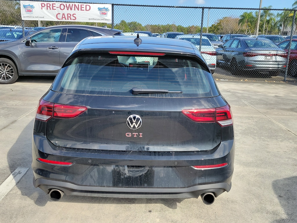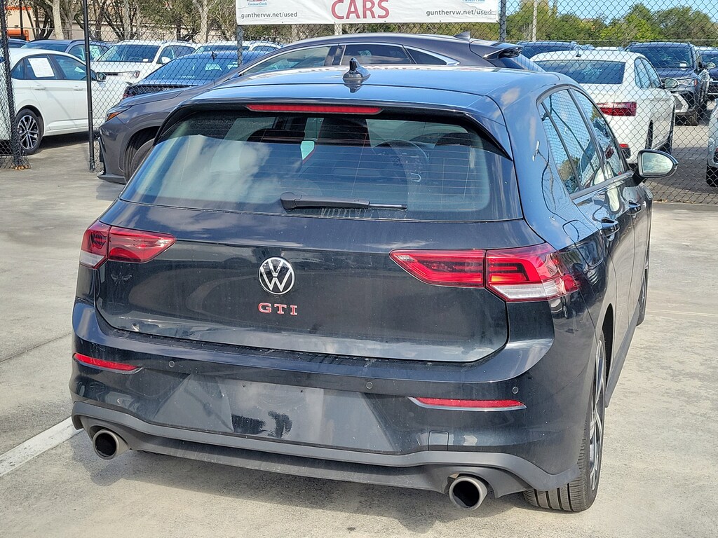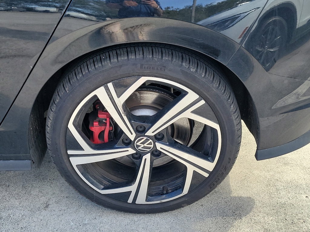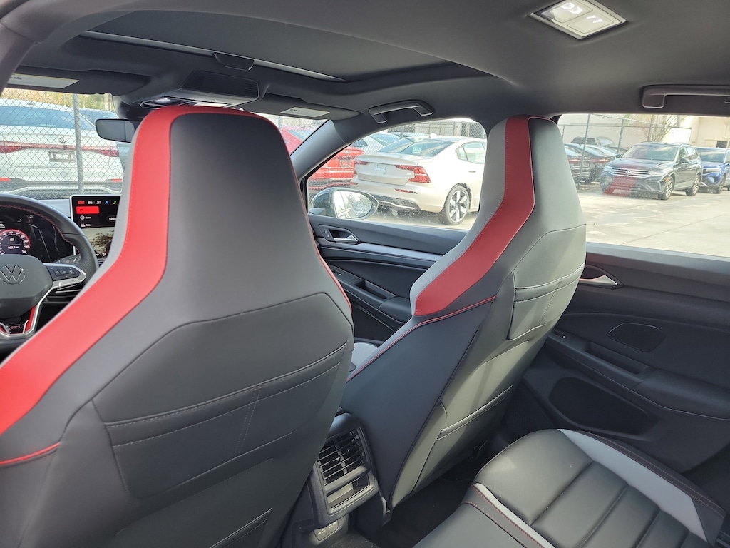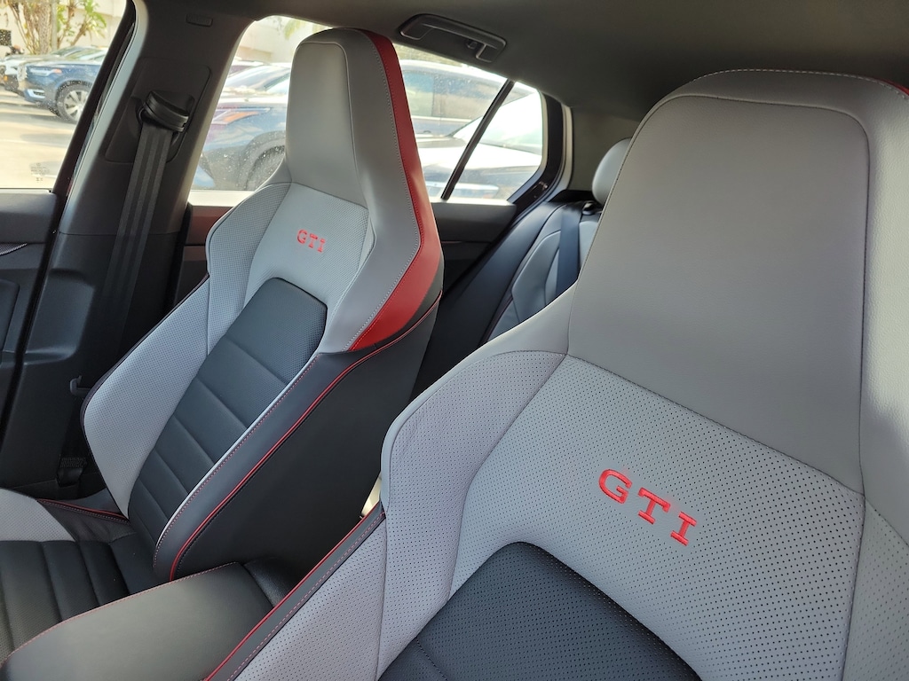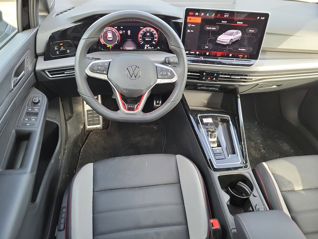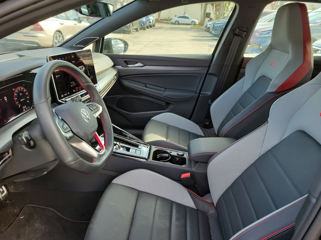 CARFAX One-Owner. Black Metallic 2025 Volkswagen Golf GTI 2.0T SE 2.0L TSI DOHC 7-Speed DSG Automatic with Tiptronic FWD SE Leather Seating Package (Actively Ventilated Front Seats, Padded Door Panels with Leatherette Inserts, Perforated Vienna Leather Seating Surfaces, and Power Adjustable Driver's Seat w/3 Position Memory), 4-Wheel Disc Brakes, 9 Speakers, ABS brakes, Air Conditioning, Alloy wheels, AM/FM radio: SiriusXM with 360L, ArtVelours Seating Surfaces, Auto High-beam Headlights, Auto-dimming Rear-View mirror, Automatic temperature control, Brake assist, Bumpers: body-color, Compass, Delay-off headlights, Driver door bin, Driver vanity mirror, Dual front impact airbags, Dual front side impact airbags, Electronic Stability Control, Emergency communication system: VW Car-Net Safe & Secure 5-year, Exterior Parking Camera Rear, Forward collision: FCW w/Autonomous Emergency Braking mitigation, Four wheel independent suspension, Front anti-roll bar, Front Bucket Seats, Front Center Armrest, Front fog lights, Front reading lights, Fully automatic headlights, harman/kardon® Speakers, Heated door mirrors, Heated front seats, Heated Front Top Sport Seats, Heated steering wheel, Illuminated entry, Leather steering wheel, Low tire pressure warning, Navigation System, Occupant sensing airbag, Outside temperature display, Overhead airbag, Overhead console, Panic alarm, Passenger door bin, Passenger vanity mirror, Power door mirrors, Power driver seat, Power moonroof: Panoramic, Power passenger seat, Power steering, Power windows, Radio data system, Radio: MIB3 Discover Pro AM/FM/HD With12.9" Touchscreen Navigation, Rain sensing wipers, Rear anti-roll bar, Rear reading lights, Rear seat center armrest, Rear window defroster, Rear window wiper, Remote keyless entry, Security system, Speed control, Speed-sensing steering, Speed-Sensitive Wipers, Split folding rear seat, Spoiler, Sport steering wheel, Steering wheel mounted audio controls, Tachometer, Telescoping steering wheel, Tilt steering wheel, Traction control, Trip computer, Turn signal indicator mirrors, Variably intermittent wipers, and Wheels: 18" 2-Tone Diamond-Turned Alloy.