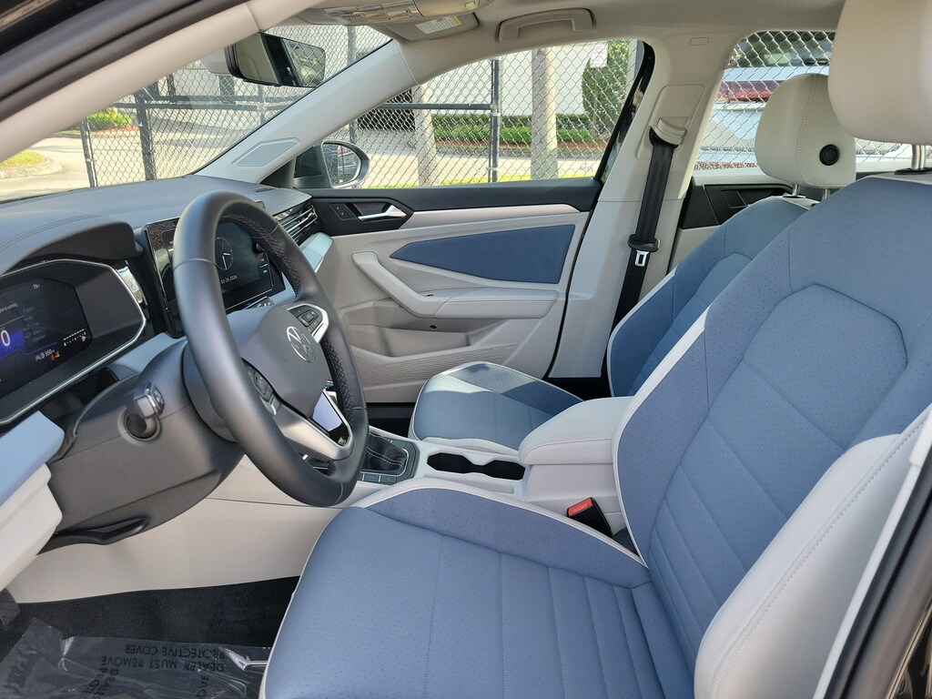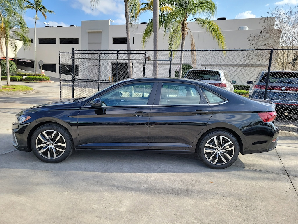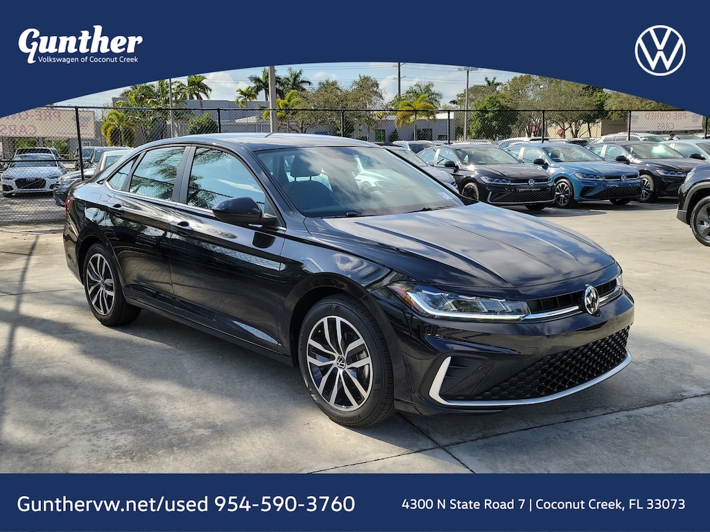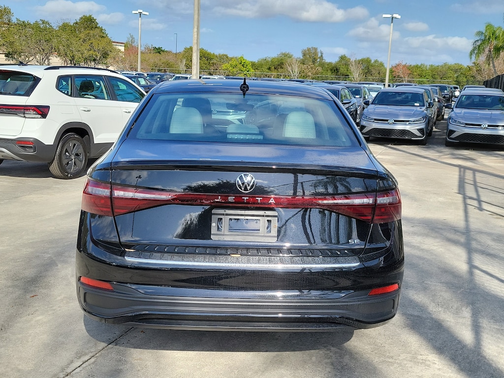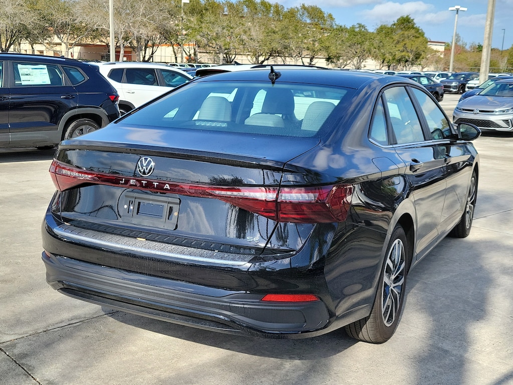 CARFAX One-Owner. Deep Black 2025 Volkswagen Jetta 1.5T SE 1.5L I-4 DI DOHC Turbocharged 8-Speed Automatic with Tiptronic FWD Sunroof Package (Power Tilting & Sliding Sunroof), 4-Wheel Disc Brakes, 6 Speakers, ABS brakes, Active Blind Spot Monitor, Air Conditioning, Alloy wheels, AM/FM radio: SiriusXM with 360L, Auto-dimming Rear-View mirror, Auto-Dimming Rearview Mirror w/HomeLink Connect, Automatic temperature control, Brake assist, Bumpers: body-color, CloudTex & V-Tex Leatherette Seat Trim, Delay-off headlights, Driver door bin, Driver vanity mirror, Dual front impact airbags, Dual front side impact airbags, Electronic Stability Control, Emergency communication system: VW Car-Net Safe & Secure 5-year, Exterior Parking Camera Rear, Front anti-roll bar, Front Bucket Seats, Front Center Armrest, Front dual zone A/C, Front wheel independent suspension, Fully automatic headlights, Heated door mirrors, Heated Front Seats, Heated front seats, Illuminated entry, Leather Shift Knob, Leather steering wheel, Low tire pressure warning, Occupant sensing airbag, Outside temperature display, Overhead airbag, Overhead console, Panic alarm, Passenger door bin, Passenger vanity mirror, Power door mirrors, Power driver seat, Power steering, Power windows, Radio data system, Radio: MIB3 Composition Media w/8" Touchscreen, Rain sensing wipers, Rear anti-roll bar, Rear reading lights, Rear seat center armrest, Rear window defroster, Remote keyless entry, Speed control, Speed-sensing steering, Split folding rear seat, Steering wheel mounted audio controls, Tachometer, Telescoping steering wheel, Tilt steering wheel, Traction control, Trip computer, Variably intermittent wipers, and Wheels: 17" Twin 5-Spoke 2-Tone Machined Alloy.