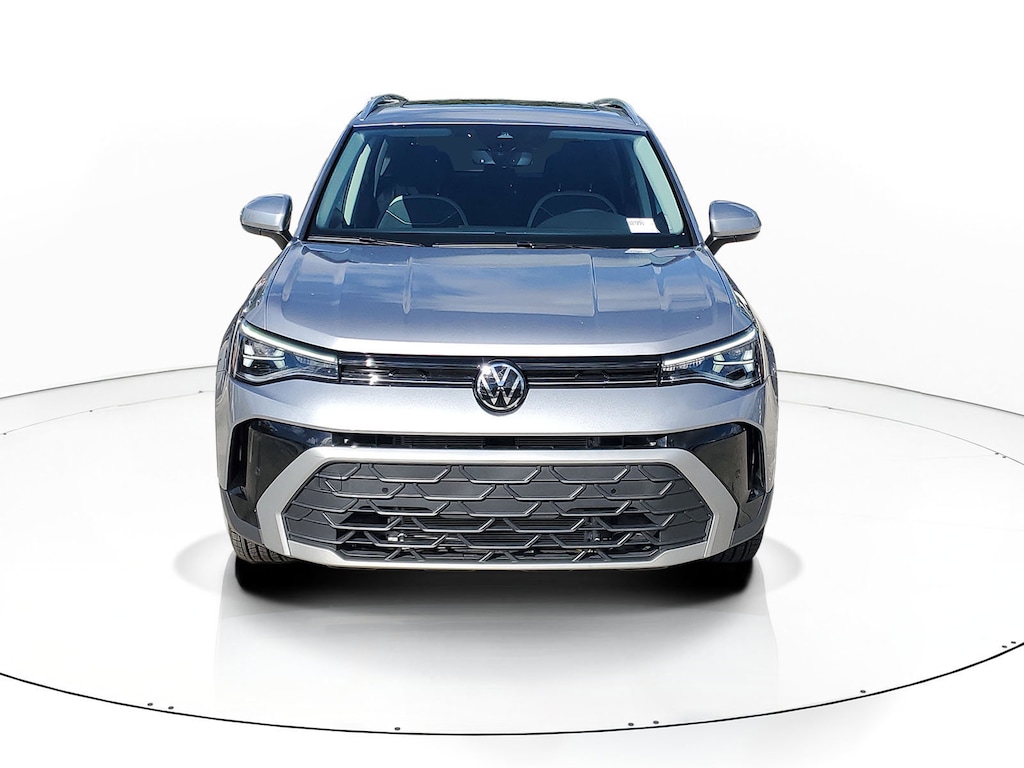 CARFAX One-Owner. Silver Metallic 2025 Volkswagen Taos 1.5T SE 1.5L I4 Turbocharged DOHC 16V LEV3-SULEV30 174hp 8-Speed Automatic with Tiptronic FWD Panoramic Sunroof Package, 4-Wheel Disc Brakes, 6 Speakers, ABS brakes, Active Blind Spot Monitor, Air Conditioning, Alloy wheels, AM/FM radio: SiriusXM with 360L, Auto High-beam Headlights, Auto-Dimming Rearview Mirror with HomeLink Connect, Automatic temperature control, Brake assist, Bumpers: body-color, Cloudtex and Cloth Seating Surfaces, Compass, Delay-off headlights, Driver door bin, Driver vanity mirror, Dual front impact airbags, Dual front side impact airbags, Electronic Stability Control, Emergency communication system: VW Car-Net Safe & Secure 5-year, Exterior Parking Camera Rear, Front anti-roll bar, Front Bucket Seats, Front Center Armrest, Front dual zone A/C, Front reading lights, Front Strut Rear Torsion Beam Suspension, Front wheel independent suspension, Fully automatic headlights, Heated door mirrors, Heated Front Bucket Seats, Heated front seats, Heated steering wheel, Illuminated entry, Leather Shift Knob, Low tire pressure warning, Occupant sensing airbag, Outside temperature display, Overhead airbag, Overhead console, Panic alarm, Passenger door bin, Passenger vanity mirror, Power door mirrors, Power driver seat, Power steering, Power windows, Radio data system, Radio: MIB3 Composition Media AM/FM/HD, Rain sensing wipers, Rear anti-roll bar, Rear seat center armrest, Rear window defroster, Rear window wiper, Remote keyless entry, Rubber Mats Kit, Security system, Speed control, Speed-sensing steering, Split folding rear seat, Spoiler, Steering wheel mounted audio controls, Tachometer, Telescoping steering wheel, Tilt steering wheel, Traction control, Trip computer, Variably intermittent wipers, and Wheels: 18" 2-Tone Machined Alloy.