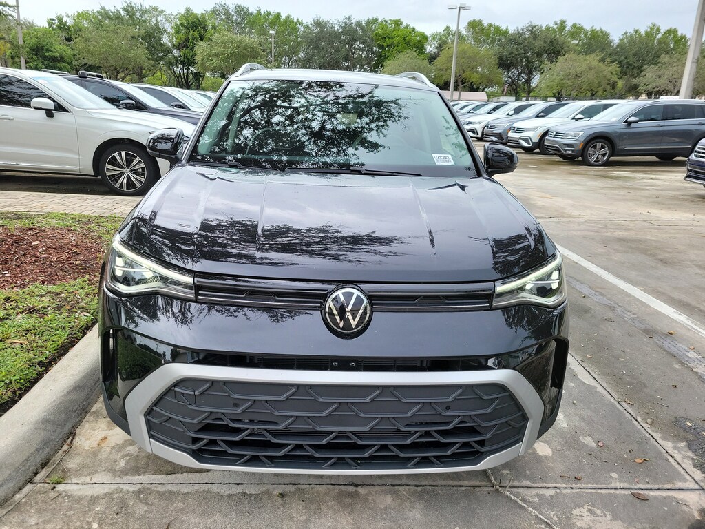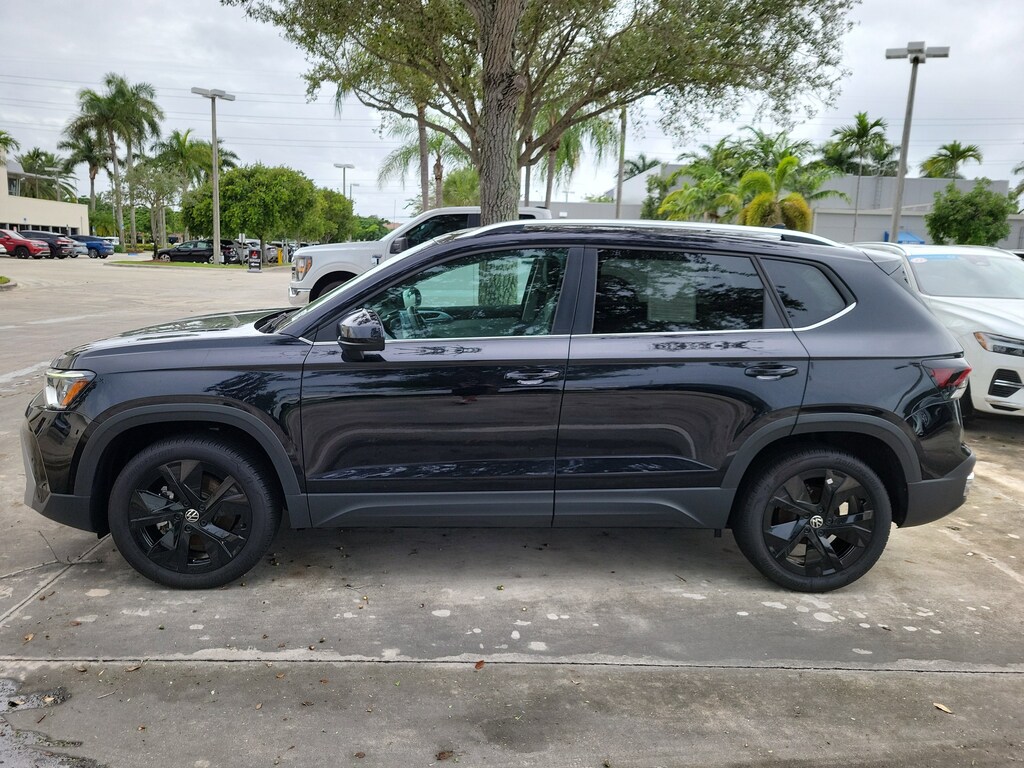 CARFAX One-Owner. Deep Black 2025 Volkswagen Taos 1.5T SE 1.5L I4 Turbocharged DOHC 16V LEV3-SULEV30 174hp 8-Speed Automatic with Tiptronic FWD Black Wheel Package (Wheels: 18" Black Painted Alloy), Panoramic Sunroof Package, 4-Wheel Disc Brakes, 6 Speakers, ABS brakes, Active Blind Spot Monitor, Air Conditioning, Alloy wheels, AM/FM radio: SiriusXM with 360L, Auto High-beam Headlights, Auto-Dimming Rearview Mirror w/HomeLink Connect, Automatic temperature control, Black Bumperdillo Protection Plate for Rear Bumper, Brake assist, Bumpers: body-color, CloudTex & Cloth Seating Surfaces, Compass, Delay-off headlights, Driver door bin, Driver vanity mirror, Dual front impact airbags, Dual front side impact airbags, Electronic Stability Control, Emergency communication system: VW Car-Net Safe & Secure 5-year, Exterior Parking Camera Rear, Front anti-roll bar, Front Bucket Seats, Front Center Armrest, Front dual zone A/C, Front reading lights, Front Strut Rear Torsion Beam Suspension, Front wheel independent suspension, Fully automatic headlights, Heated door mirrors, Heated Front Bucket Seats, Heated front seats, Heated steering wheel, Illuminated entry, Leather Shift Knob, Low tire pressure warning, Occupant sensing airbag, Outside temperature display, Overhead airbag, Overhead console, Panic alarm, Passenger door bin, Passenger vanity mirror, Power door mirrors, Power driver seat, Power steering, Power windows, Radio data system, Radio: MIB3 Composition Media AM/FM/HD, Rain sensing wipers, Rear anti-roll bar, Rear seat center armrest, Rear window defroster, Rear window wiper, Remote keyless entry, Rubber Mats Kit, Security system, Speed control, Speed-sensing steering, Split folding rear seat, Spoiler, Steering wheel mounted audio controls, Tachometer, Telescoping steering wheel, Tilt steering wheel, Traction control, Trip computer, Variably intermittent wipers, and Wheels: 18" 2-Tone Machined Alloy.