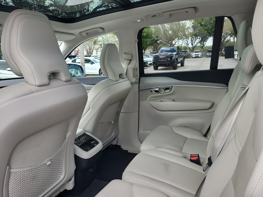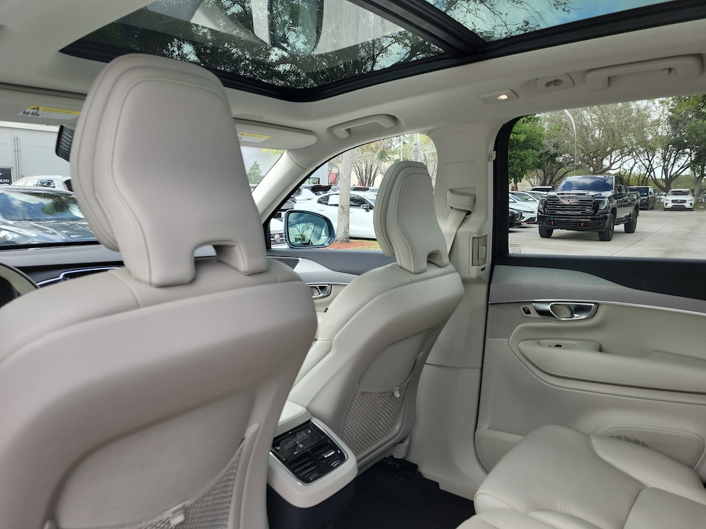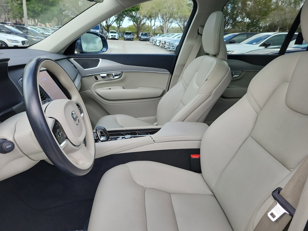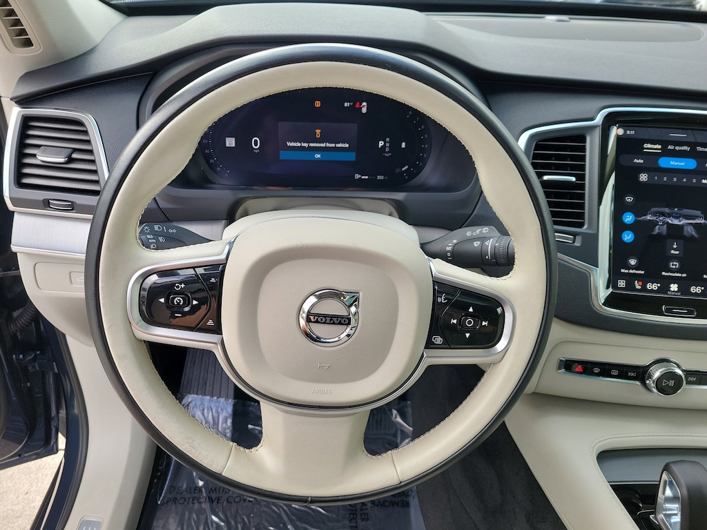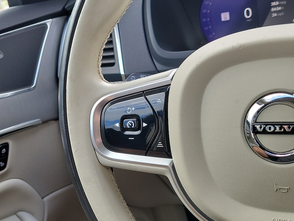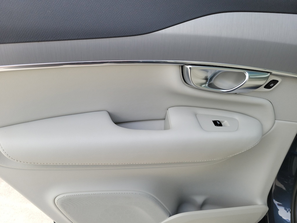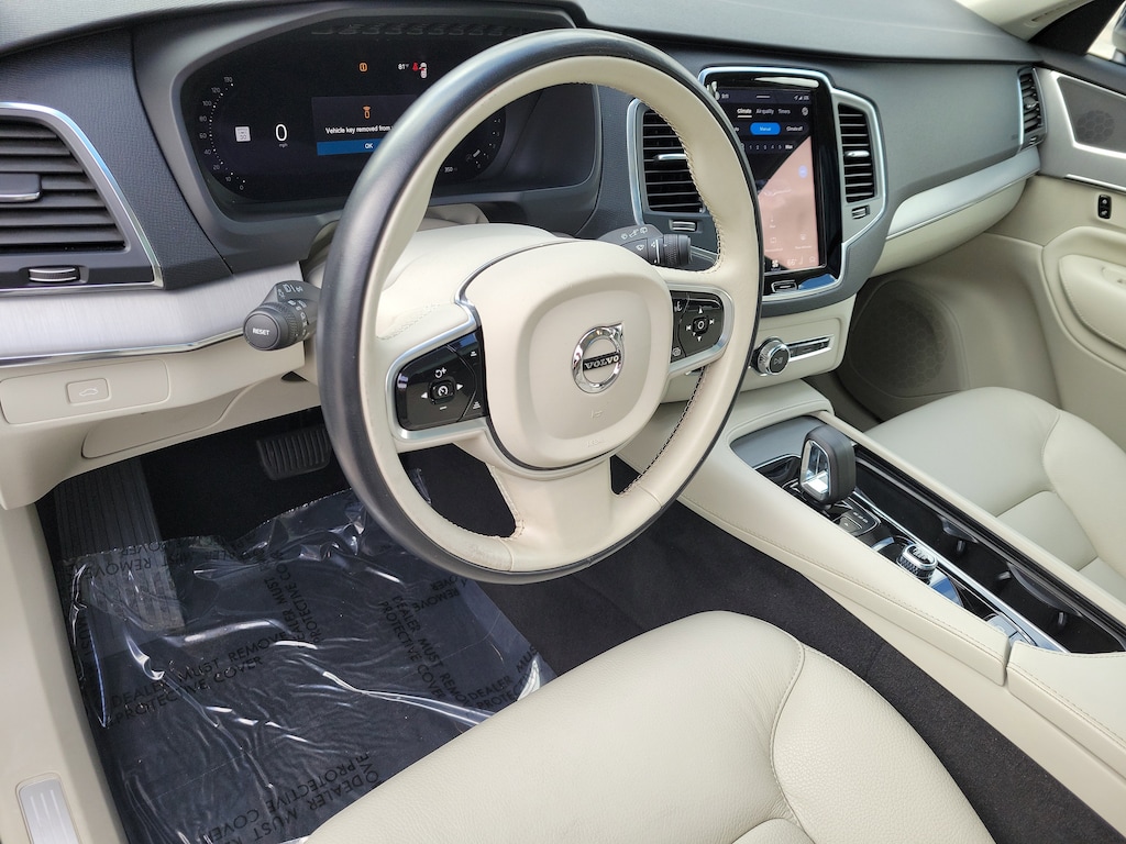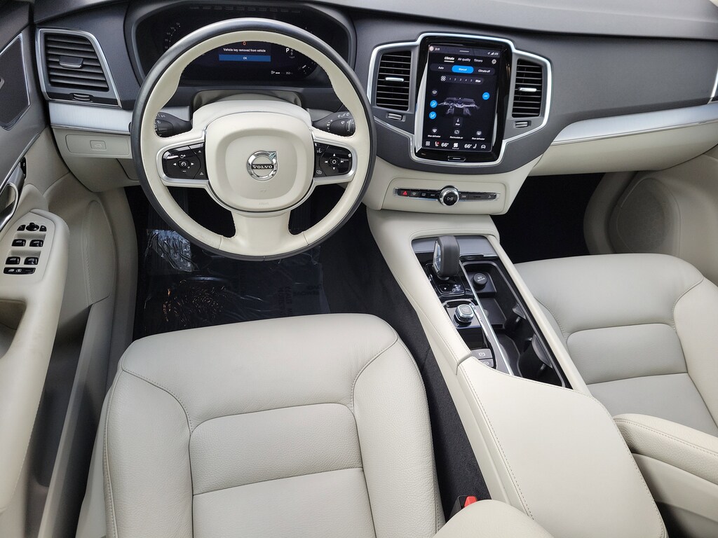 CARFAX One-Owner. Denim Blue Metallic 2023 Volvo XC90 B5 Core 2.0L I4 Turbocharged DOHC 16V LEV3-ULEV70 Automatic with Geartronic AWD Climate Package (Heated Rear Seats and Heated Steering Wheel), Protection Package Premier (Bumper Cover, Cargo Tray, First Aid Kit, Rubber Floor Mats, and Wheel Locks), 10 Speakers, 3rd row seats: bucket, 4-Wheel Disc Brakes, ABS brakes, Air Conditioning, Alloy wheels, AM/FM radio: SiriusXM, Anti-whiplash front head restraints, Apple CarPlay, Auto High-beam Headlights, Auto-dimming door mirrors, Auto-dimming Rear-View mirror, Automatic temperature control, Brake assist, Bumpers: body-color, Delay-off headlights, Driver door bin, Driver vanity mirror, Dual front impact airbags, Dual front side impact airbags, Electronic Stability Control, Emergency communication system: Volvo Cars App w/4 Year Subscription, Exterior Parking Camera Rear, Four wheel independent suspension, Front anti-roll bar, Front Bucket Seats, Front Center Armrest w/Storage, Front dual zone A/C, Front fog lights, Front reading lights, Fully automatic headlights, Garage door transmitter: HomeLink, Heated door mirrors, Heated Front Bucket Seats, Heated front seats, Illuminated entry, Knee airbag, Leather Shift Knob, Leatherette Upholstery, Low tire pressure warning, Memory seat, Navigation System, Occupant sensing airbag, Outside temperature display, Overhead airbag, Panic alarm, Passenger door bin, Passenger vanity mirror, Power door mirrors, Power driver seat, Power moonroof, Power passenger seat, Power steering, Power windows, Radio data system, Radio: High Performance Audio System, Rain sensing wipers, Rear air conditioning, Rear anti-roll bar, Rear dual zone A/C, Rear fog lights, Rear reading lights, Rear seat center armrest, Rear window defroster, Rear window wiper, Remote keyless entry, Security system, Speed control, Speed-sensing steering, Split folding rear seat, Spoiler, Steering wheel mounted audio controls, Tachometer, Telescoping steering wheel, Traction control, Trip computer, Turn signal indicator mirrors, Variably intermittent wipers, and Wheels: 19" 6-Spoke Turbine Sparkling Silver Alloy.